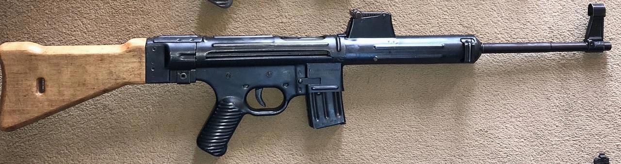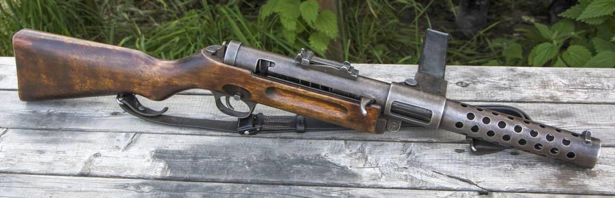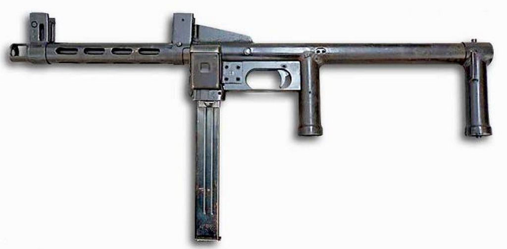 Говорят, что на самом деле его спроектировали ещё в 1943 году. Сейчас есть несколько версий по поводу деталей этой конструкции. Мне кожух ствола напоминает о нашем ППС, а про остальное ничего сказать не могу. Весил этот анекдот почти 5 кг без патронов. Может поэтому и в крупную серию так и не пошёл. На сегодня – гордость коллекционера.