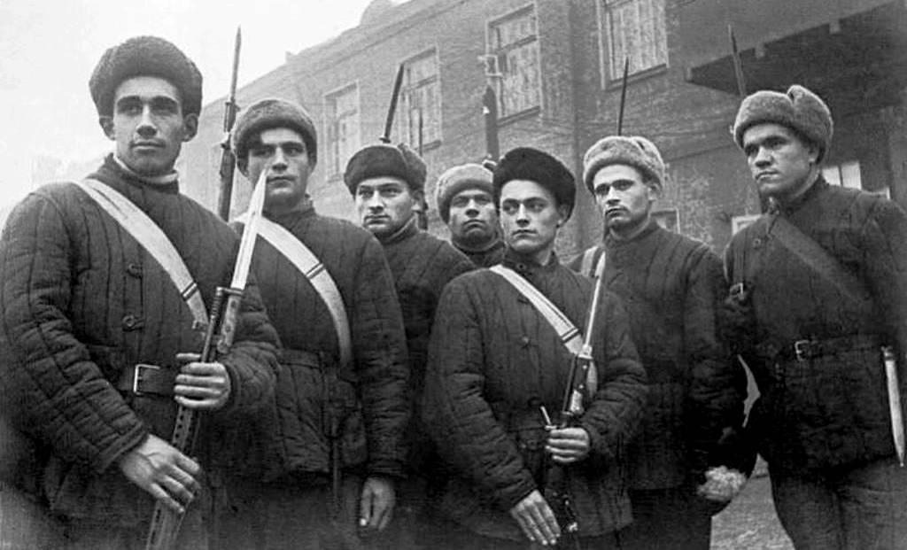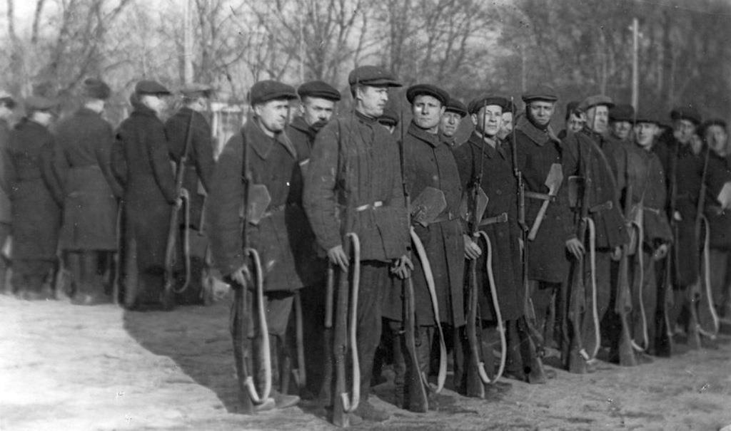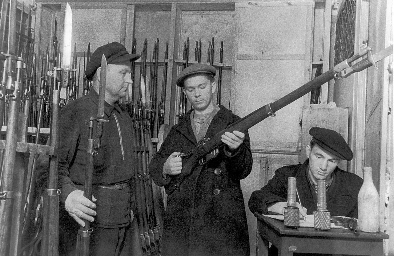 А вот бойцы получают оружие. Всё очень просто – столик с жестяным инвентарным номерком, «пирамида» с винтовками… иностранного производства (Mannlicher M.95) из «спецхрана». Да, было и такое: