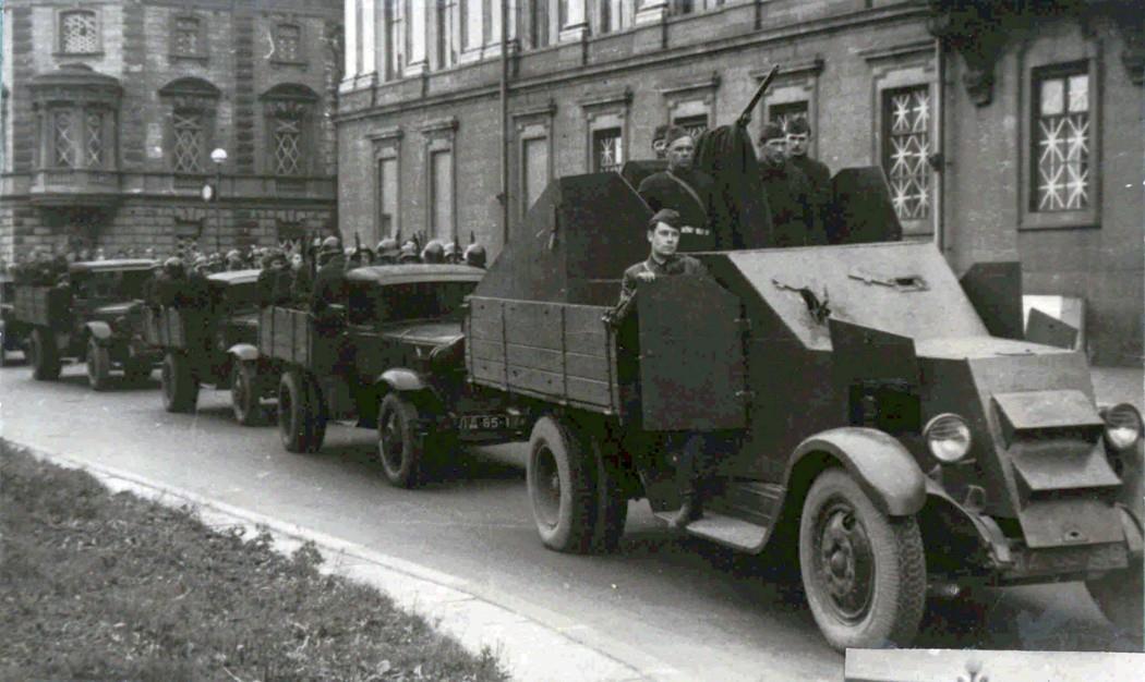 Бывало и покруче. Вот на марше колонна ополченцев Ленинграда. Пешком? Зачем – есть свой автотранспорт. Колонну возглавляет автомобиль Ижорского завода с навешенной бронезащитой и автоматической пушкой «Эрликон» (если я не ошибаюсь):