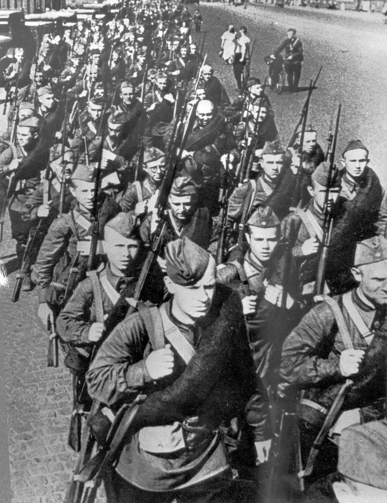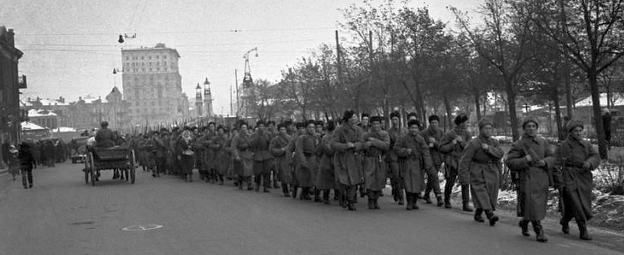 А вот здесь марширует по родным улицам столичное ополчение. И всё то же – форма, вооружение – всё в порядке:
