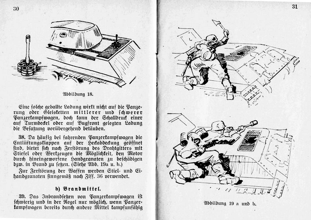 Тем временем война перешла в Европу. А там с плотностью застройки было куда лучше, чем у нас. Казалось бы – вот он, пришёл звёздный час гранатомётов. Нет. Не пришёл. По данным доклада Отдела эксплуатации БТиМВ 2-го Украинского фронта из 160 боевых повреждений танков и САУ только 2 (два) отнесли на счёт «панцерфаустов»: одному Т-34 разбили гусеницу и одному угодили в борт. В результате попадания появилась трещина на броне. В обоих случаях стреляли с 50-ти метров. Другие донесения также особым отношением к новому оружию не отметились. Согласитесь – не густо. Да и сами немцы в эффективность этого оружия особо не верили, и продолжали печатать вот такие инструкции по борьбе с русскими танками для своих солдат: