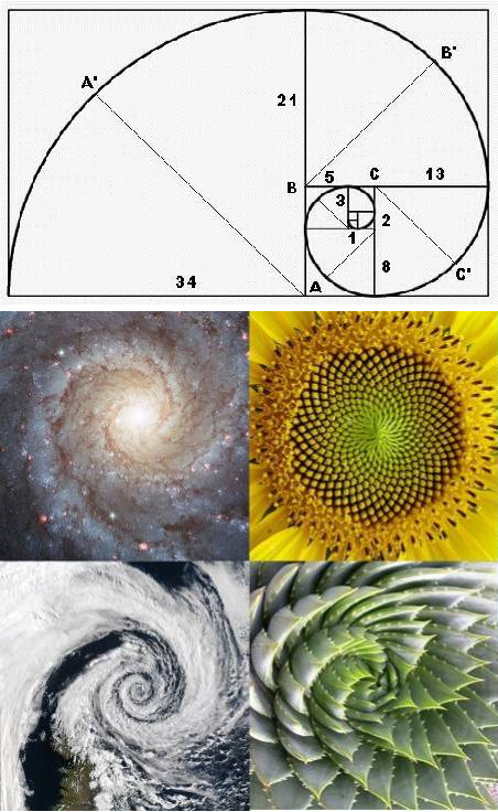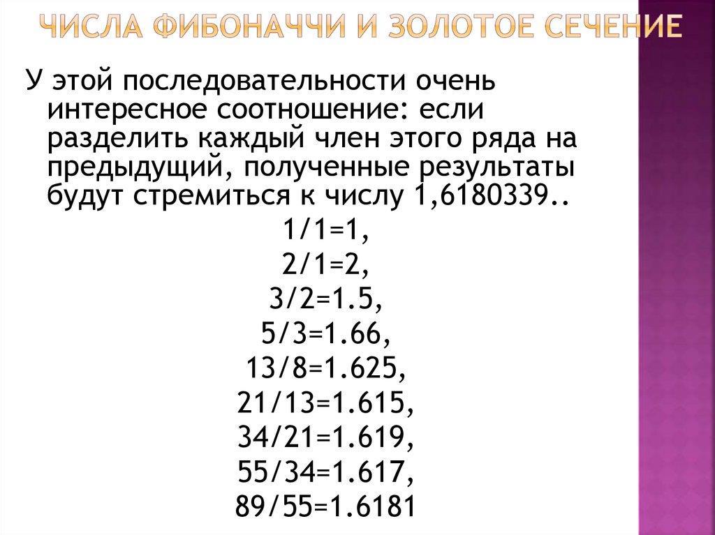 Числа Фибоначчи — последовательность, которая начинается с 0 и 1, и каждое последующее число является суммой двух предыдущих (0, 1, 1, 2, 3, 5, 8, 13, 21, 34 и т. Д.). После первых нескольких чисел в последовательности отношение любого числа к следующему более высокому составляет приблизительно 0,618 к 1; его отношение к следующему более низкому числу составляет приблизительно 1,618 к 1. Это известно как Золотое сечение.