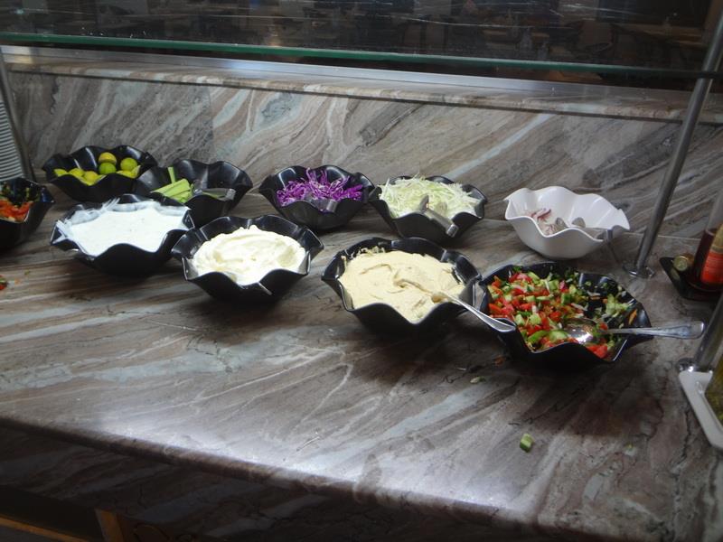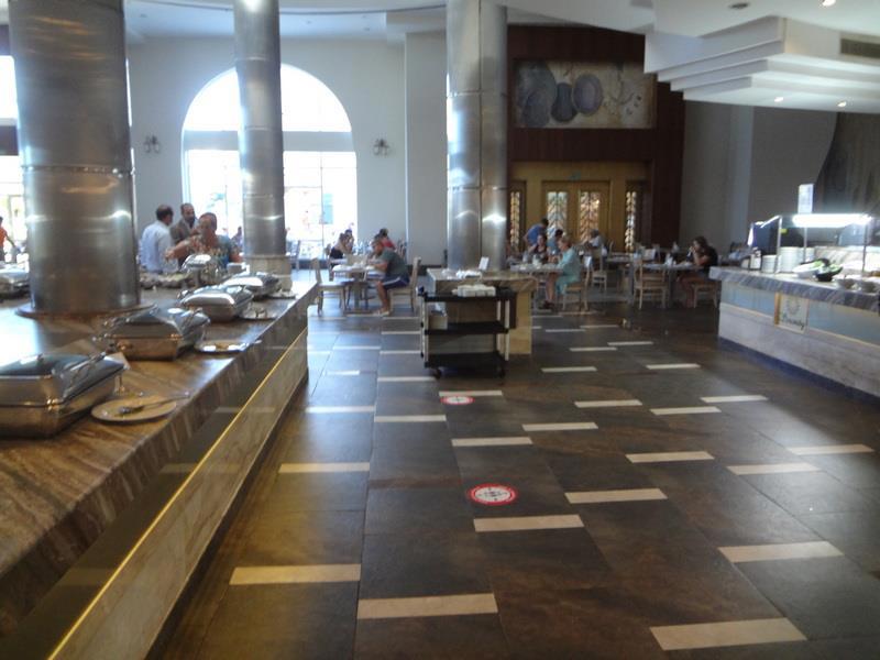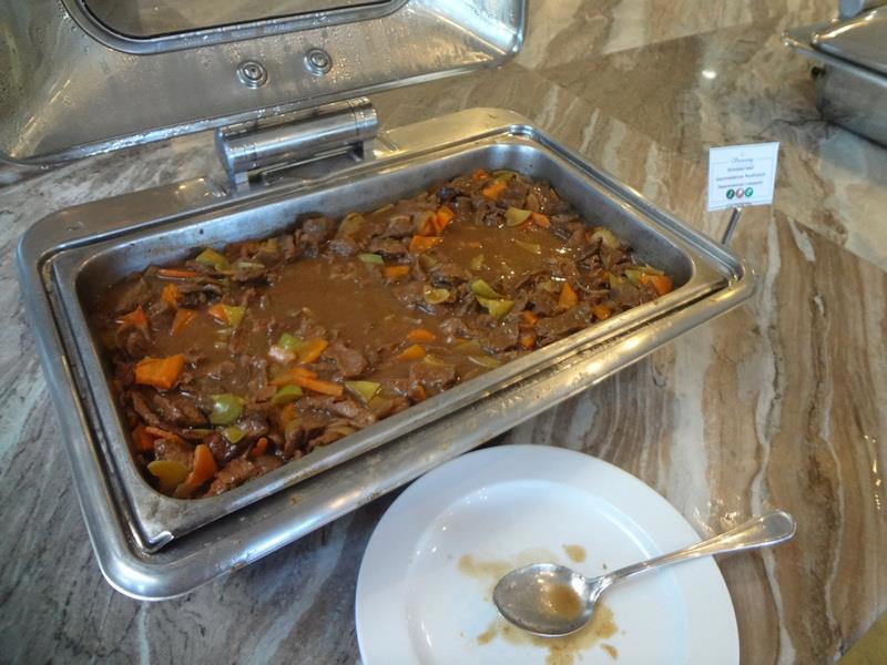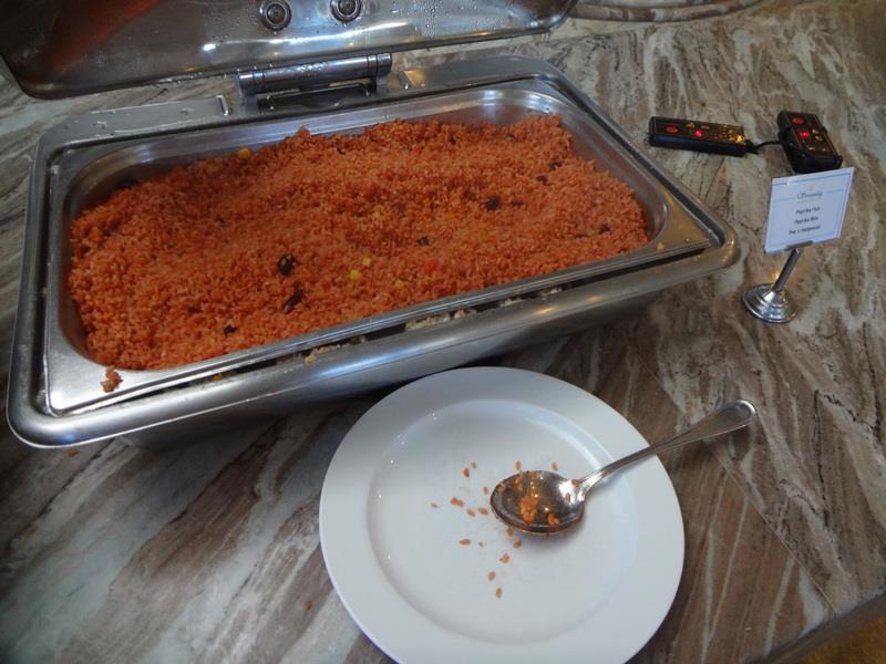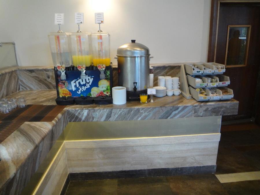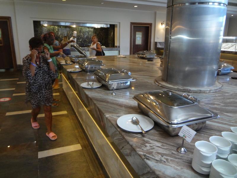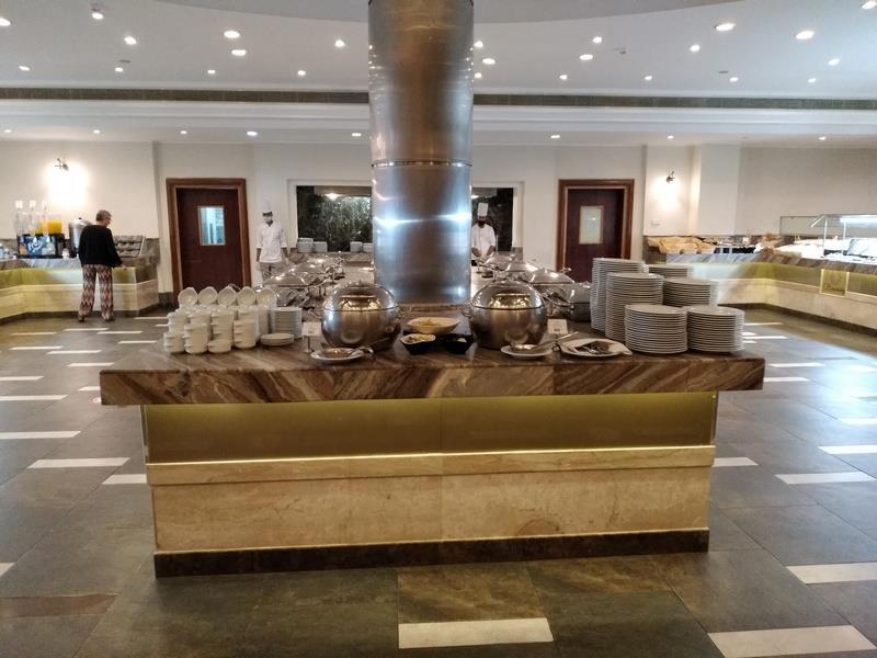 Зал ресторана отеля. Слева стойка с горячими блюдами (с закрывающимися подогреваемыми емкостями) - справа - стойка с приправами, закусками, чаем и кофе.
