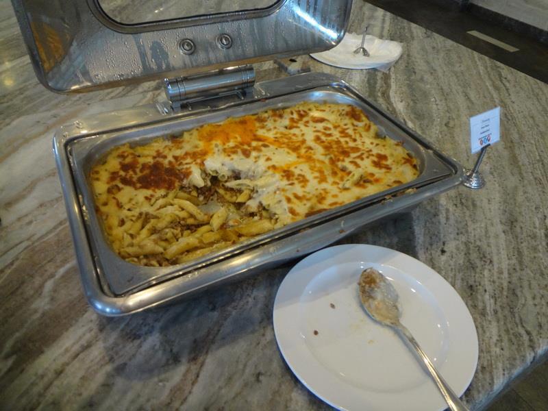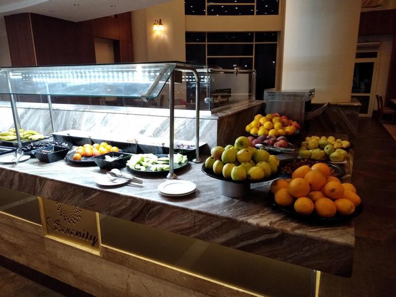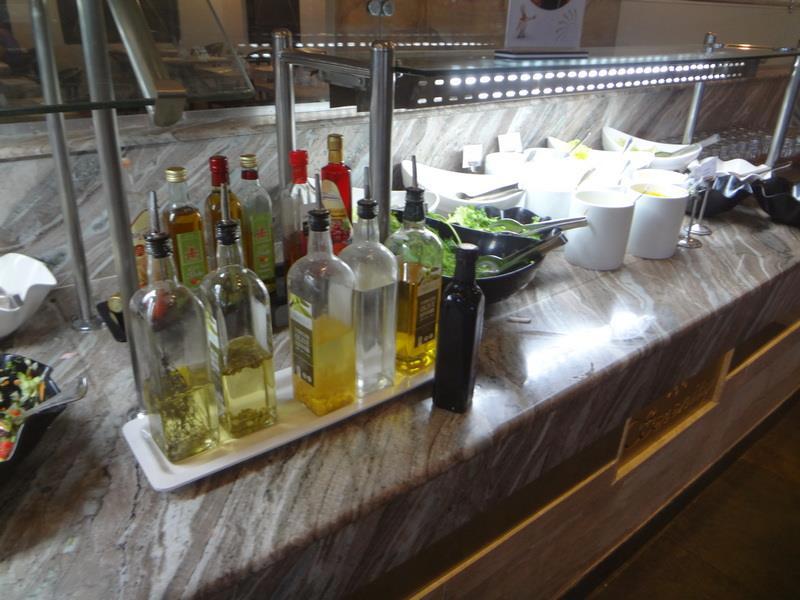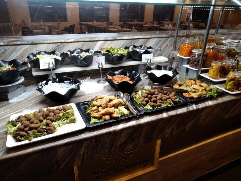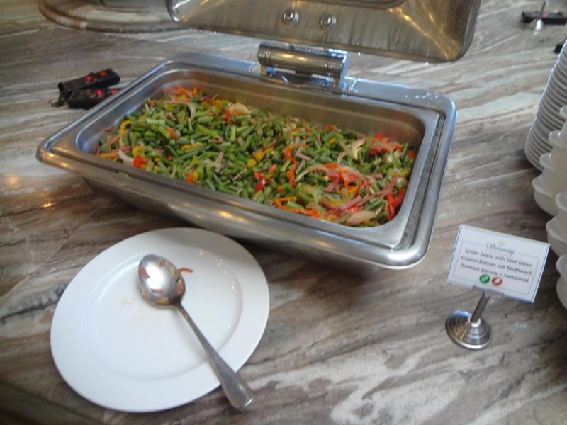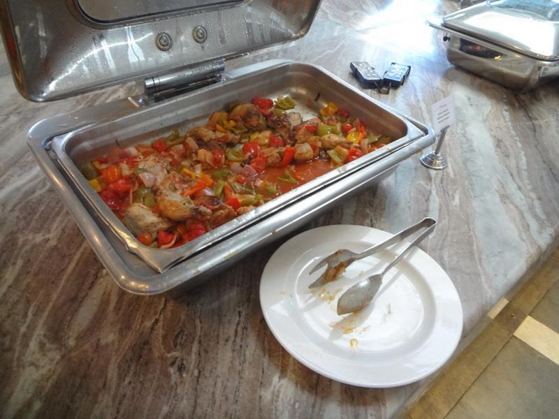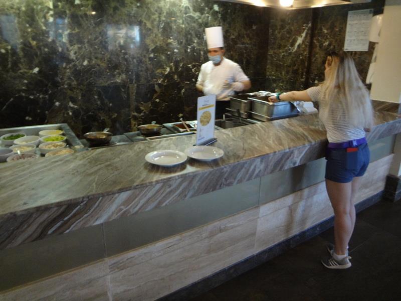 Зал ресторана отеля. Слева стойка с горячими блюдами (с закрывающимися подогреваемыми емкостями) - справа - стойка с приправами, закусками, чаем и кофе.