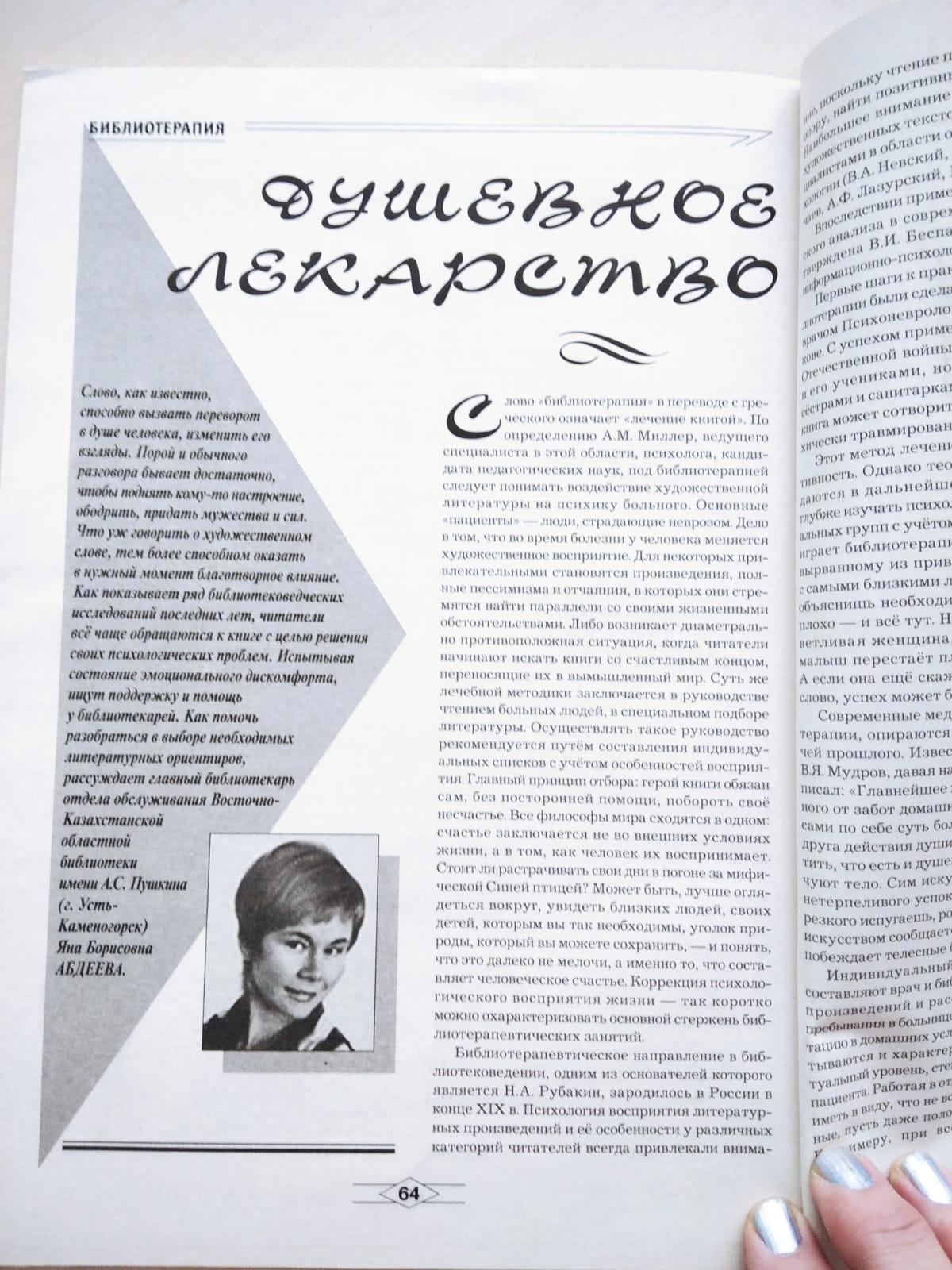 Всем здравия! Есть такая наука, хорошая, между прочим. Библиотерапия называется. Статьи автора этих строк на заявленную тему неоднократно публиковались на страницах прессы. Вот, скажем, серьезный московский научно-практический и культурно-просветительный журнал «Мир библиографии». Рубрика, которая так и называется – «Библиотерапия».