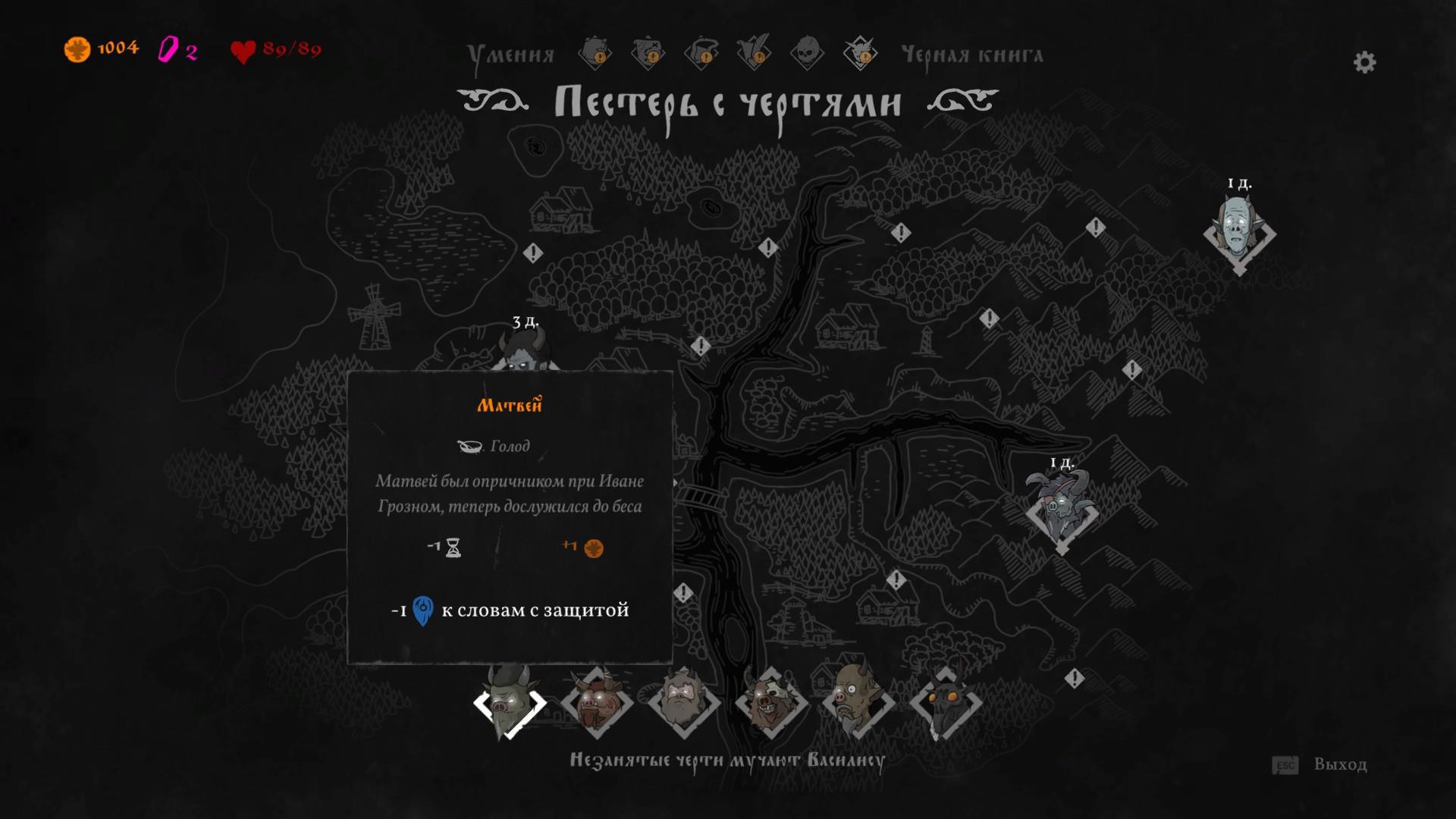 Система уровней в игре весьма проста и незамысловата. За каждый левел мы получаем пять очков здоровья, и одно очко навыков, которое можно вложить, вот ведь неожиданность, в прокачку скиллов. У нас тут есть и боевые и защитные умения, и владение чертями, и карточный мухлеж, и так далее и тому подобное.