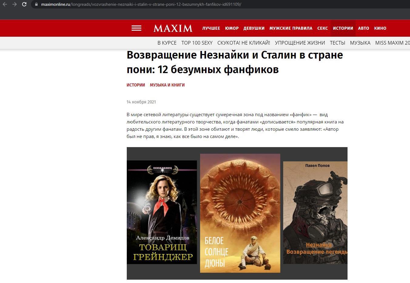 Так вот, сегодня, спасибо читателю https://author.today/u/dmitrykovalchuk я узнал прекрасную в своей сюрреалистичности новость. мой Незнайка упомянут в довольно известном мужском журнале "Максим". Та-дам