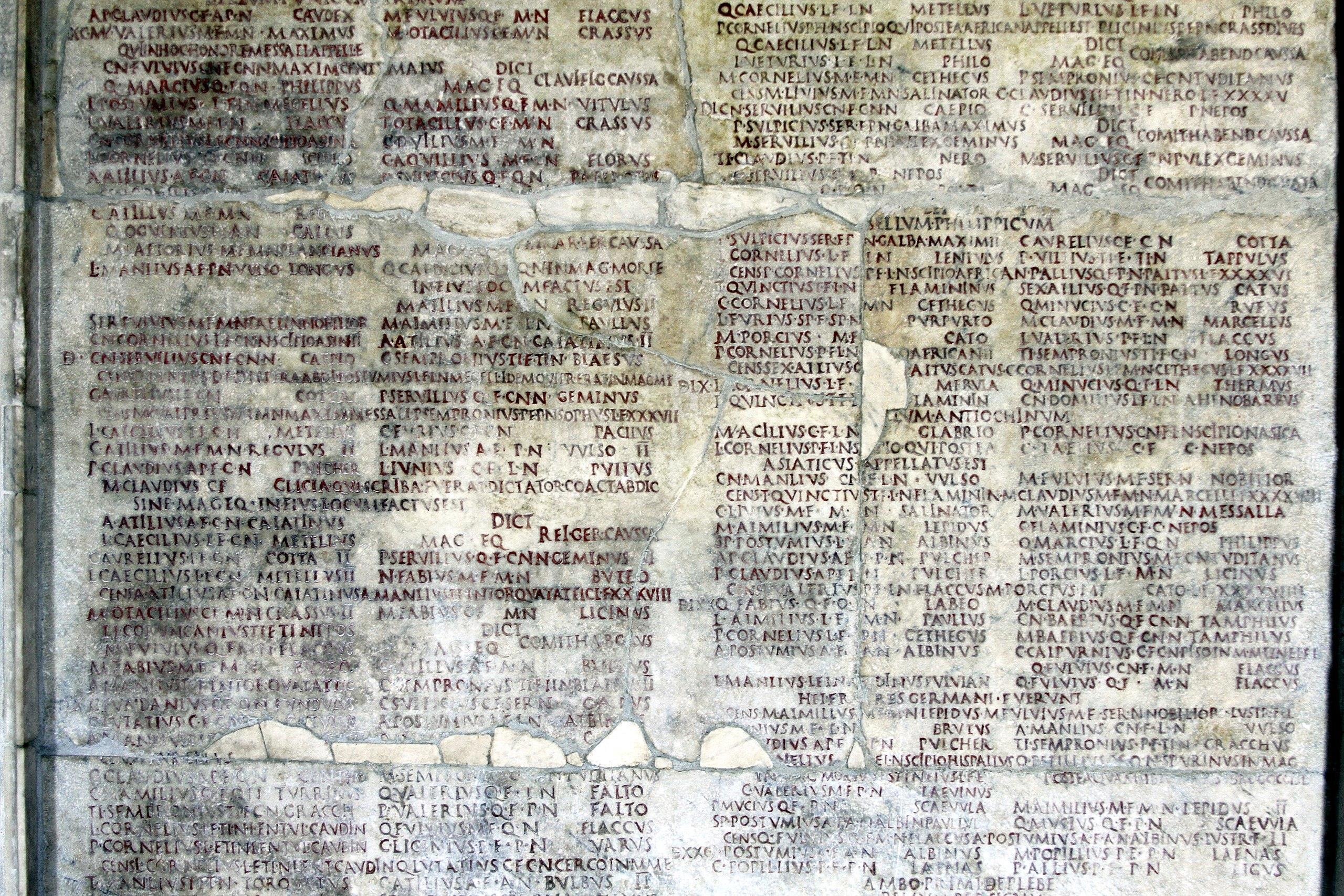 У древних римлян, которые создали свой алфавит на основе древнегреческого или этрусского, был символ для разделения слов, точка или маленький треугольник. Вот фрагмент Капитолийских фастов, которые были созданы в эпоху Октавиана Августа и содержат список консулов, диктаторов, цензоров и триумфаторов Римской республики и начального периода Римской империи. Видно, что слова разделяются точками.
