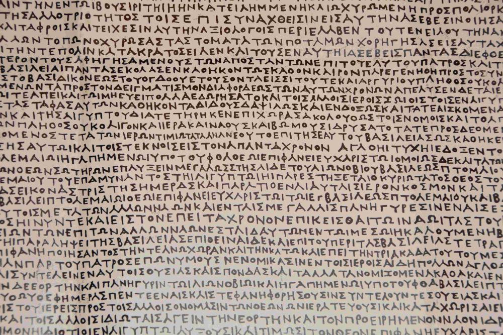 Но почти сразу же греки отказались от разделителей между словами. Ведь после появления гласных чтение перестало быть таким головоломным занятием. Вот прорисовка древнегреческой надписи на Розетском камне. Видно, что никаких разделителей тут нет и в помине.
