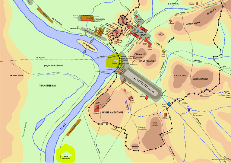 Южная часть Древнего Рима в 31 году н. э. Жёдтым помечены Порт Тиберия и Монте Тестаччо.