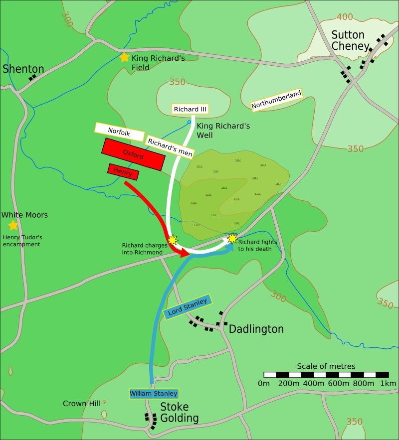 Непобедимая армия йорков стала разваливаться на глазах. В разгар этого безумия, обрадовавшийся Генрих Тюдор, поскакал со своей свитой к отрядам Стэнли, чтобы договорится с ними о совместной атаке. Увидев это, Ричард сошел с ума окончательно и ринулся наперерез Тюдору с тем самым отрядом из 80 лучших рыцарей.