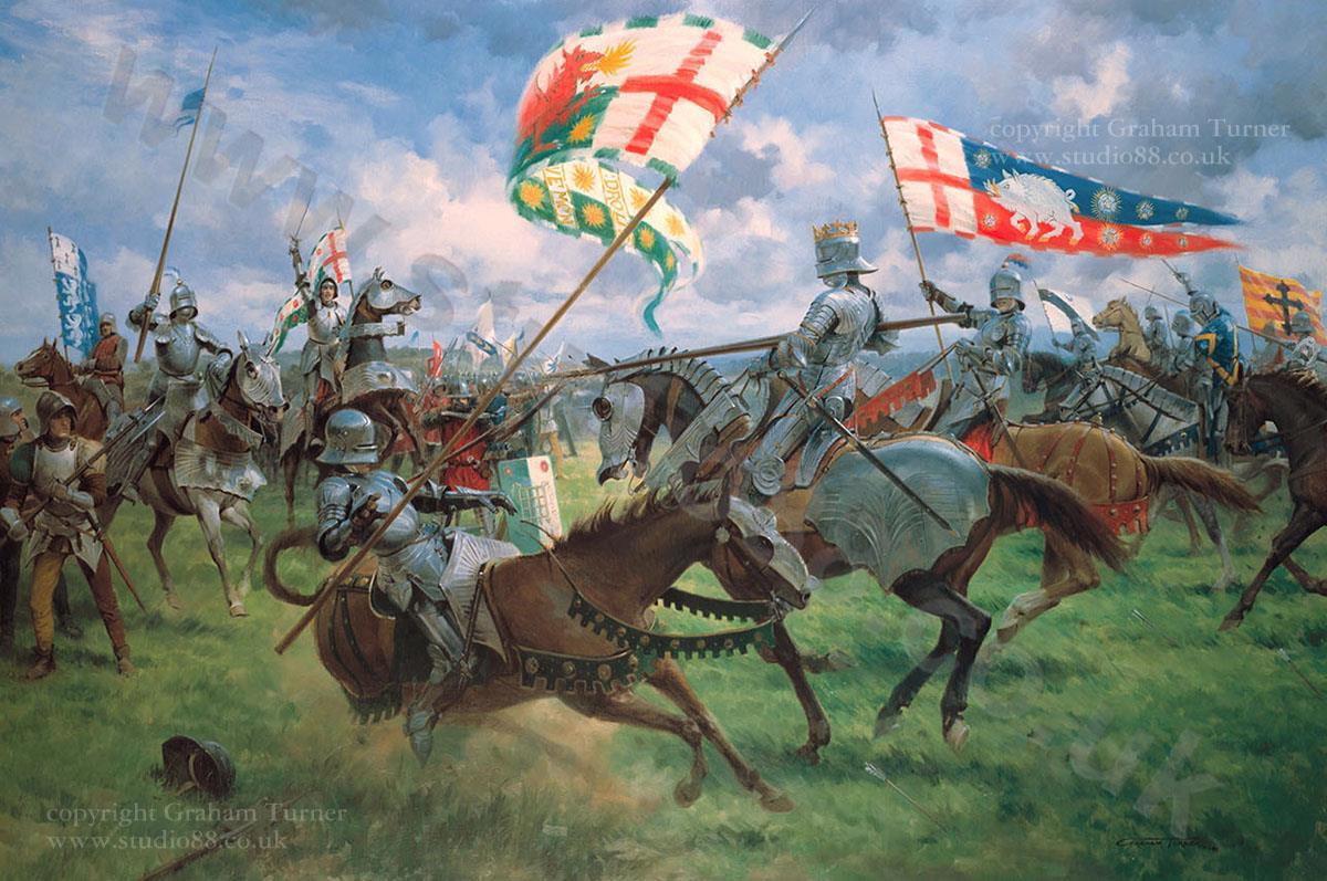 (момент атаки 80-ю рыцарями Ричарда III свиты Генриха Тюдора, поражение флага Тюдоров с драконом. Флаг Ричарда - с белым вепрем. На заднем плане слева видны отряды Стэнли с характерным белым штандартом с синей полосой и тремя оленями на полосе)