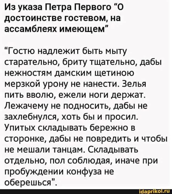 • Замечено, что жены и девицы на ассамблеях являются не зная политесу и правил одежды иностранной, яко кикиморы одеты бывают. Одев робы и фижмы из атласу белого на грязное исподнее, потеют гораздо, отчего зело гнусных запах распространяется, приводя в смятение гостей иностранных. Указываю впредь, перед ассамблеей мыться с мылом в бане со тщением и не токмо за чистотой верхней робы, но и за исподним такожды следить усердно, дабы гнусным видом своим не позорить жен российских.
