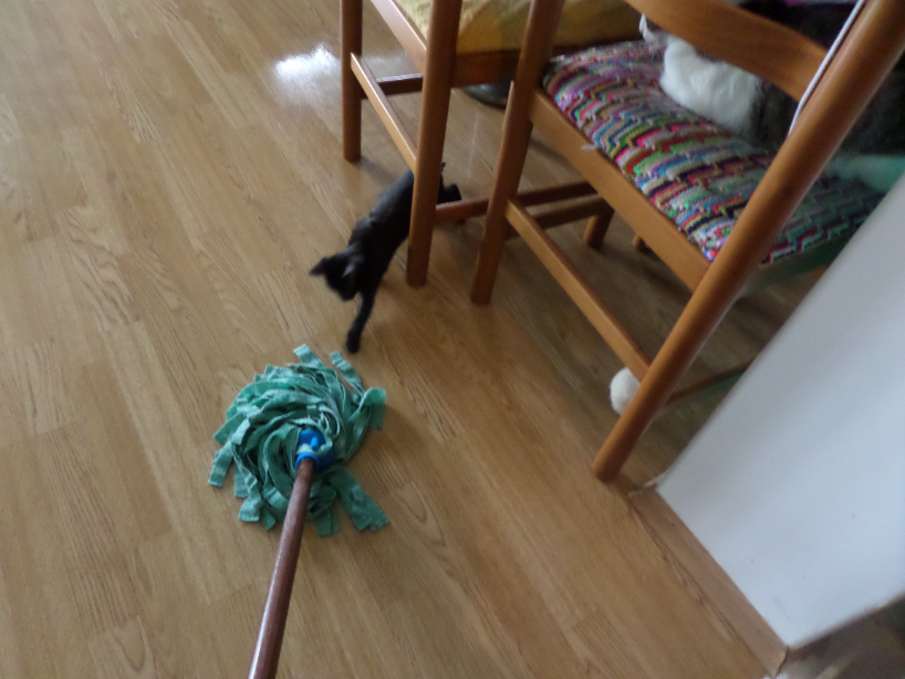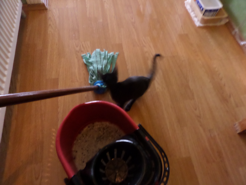 В общем, разогнала я пылесосом своих подногамипопрыгунов и спокойно взялась за швабру. Ан, нет...Не тут-то былО. Вышла наша смелая кошечка Кузя и давай гоняться за шваброй. Я уже и брыськала ей, и топала ногами, шо, мол, щас кто-то получит этой самой шваброй по любопытной морде, ничего не помогало. Кузя изо всех своих кошачьих сил носилась за шваброй туда-сюда. По помытому полу и даже не всегда на лапках. На пузе тоже проезжалась. Вот плюнула я на эти ее реверансы и мою себе дальше. Привыкла уже, что весь пол все равно в лапках.