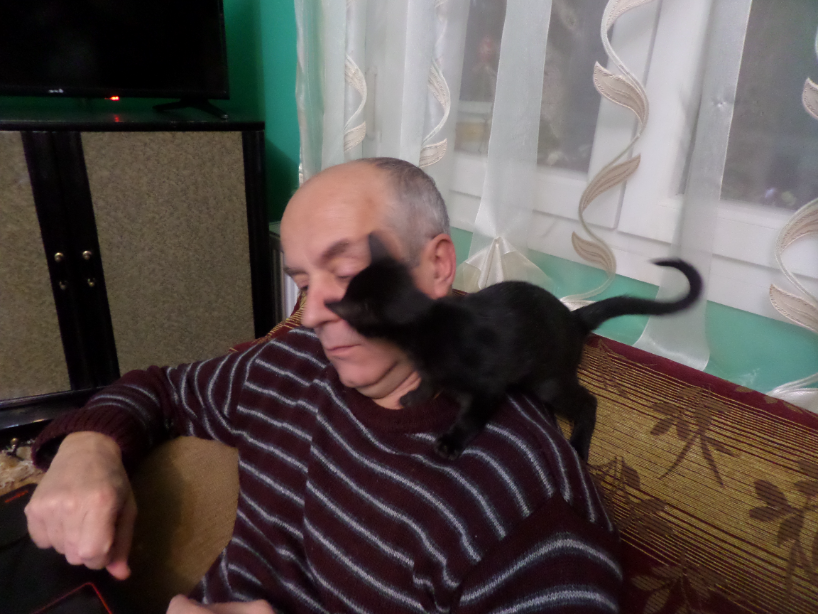 Ладно, ладно. Мы уже успокоились. Все позади. Но про Кузю еще не закончили. Чо она отчебучила вчера. Сидит муж на диване, читает и вдруг слышу, рыгочет, заливается. Чо, спрашиваю, веселишься? А ты посмотри, говорит, чо Кузя делает. А эта засранка залезла на него и облизывает ему голову, заворачивается всем телом вокруг его головы и муркотит на весь дом. Я рот открыла, сижу, смотрю. А та круги вокруг головы мужа наяривает, хвостом его заворачивает, головушкой своей толкает. Цирк, да и только. Я стала снимать, но она же крутится, на месте не стоит, ни один практически снимок не получился. А так это было здорово. А потом она видать устала, свернулась у него на груди и давай его свитер сосать, чмокать. С мамой что -ли перепутала? Бедный ребеночек. Но это была незабываемая картинка. Кузя, которая никого особо не жалует, вдруг такую любовь выплеснула на мужа, он аж дышать забыл.