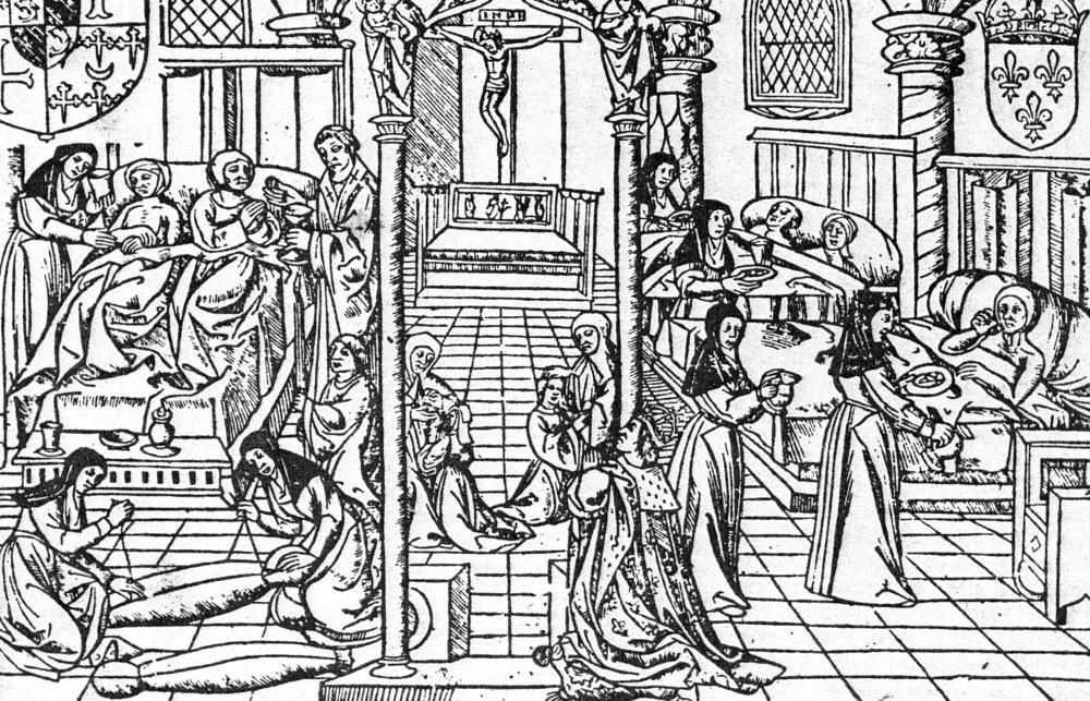 Средневековые больницы представляли собой одно общее помещение с кроватями, где размещали больных. С пришествием чумы в Европу, в больницах также стали огораживать чумные бараки. Опять же по большей части медицинская помощь сводилась к присмотру и уходу за больными, чьи хвори не считались опасными, и изоляции тех, кто был болен чумой или любой другой опасной болезнью.