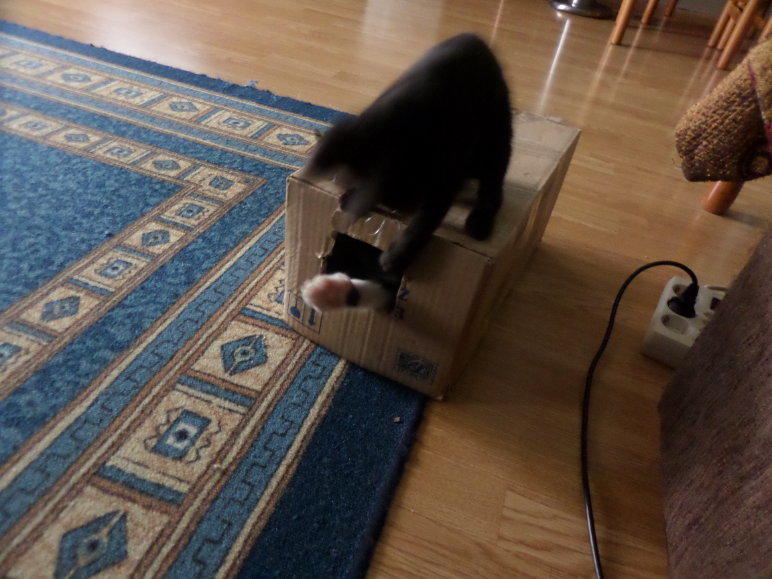 От Кузя распсиховалась, как начала дом зубами рвать, смотрю, и правда, летят клочки по закоулочкам. Ээээ, думаю, пора вмешаться. Пошла, на карачки встала, сую туда мордень свою, а оттуда лапа мохнатая высовывается и хлясь меня по фейсу.