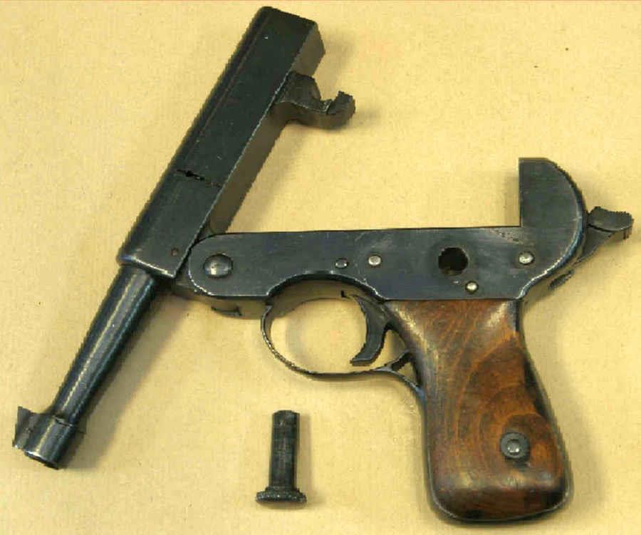 При стрельбе таким методом звуковая волна от выстрела исключалась полностью, а низкая начальная скорость вылета пули (до 240 метров в секунду) исключала возникновения свиста (баллистическая волна) при её полёте. На этой основе у него получился вот такой однозарядный пистолет калибра 5,6 мм и 6,5 мм: