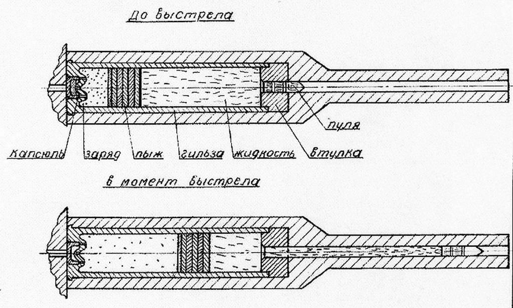 Так вот, о принципах проектирования. Гуревич, как и Митины озаботился тихой стрельбой. Однако он выбрал другой путь. Не знаю, знал ли он о старом американском патенте Бассела (см. заметочку «Тихушники») на патрон с запиранием пороховых газов и с гидравлическим толкателем, но он пошёл именно этим путём. Вот принципиальная схема его пары патрон-оружие, которую он закончил разрабатывать в 1943 году: