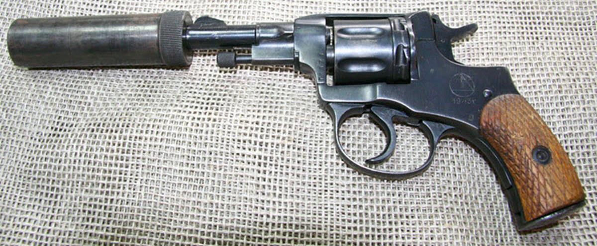 У нас эта тема возникла тоже в двух направлениях примерно в 30-х годах. Самыми известными конструкторами, которые над ней работали были братья Иван Григорьевич и Василий Григорьевич Митины. Они ещё в 1929 году сделали глушитель для револьвера Наган. Потом конструкцию применили для карабина Мосина для автоматов и даже для пулемёта Дегтярёва. В армии появился глушитель «БраМит» нескольких вариантов конструкции. Глушитель в принципе представлял собой трубку с расположенными внутри перегородками. Он несколько раз модернизировался. Со временем в нём стали устанавливать резиновые диафрагмы с крестообразной прорезью. Патрон правда при этом всё же пришлось немного переделать – использовать остроконечную пулю. «БраМит» успешно прошёл испытания, но пули с высокой начальной скоростью продолжали свистеть. Этому сначала особого внимания не придали – зато убойная сила оставалась на высоте! Вот так, например, выглядел штатный «Наган» уменьшенных размеров с глушителем «БраМит» (один из вариантов):
