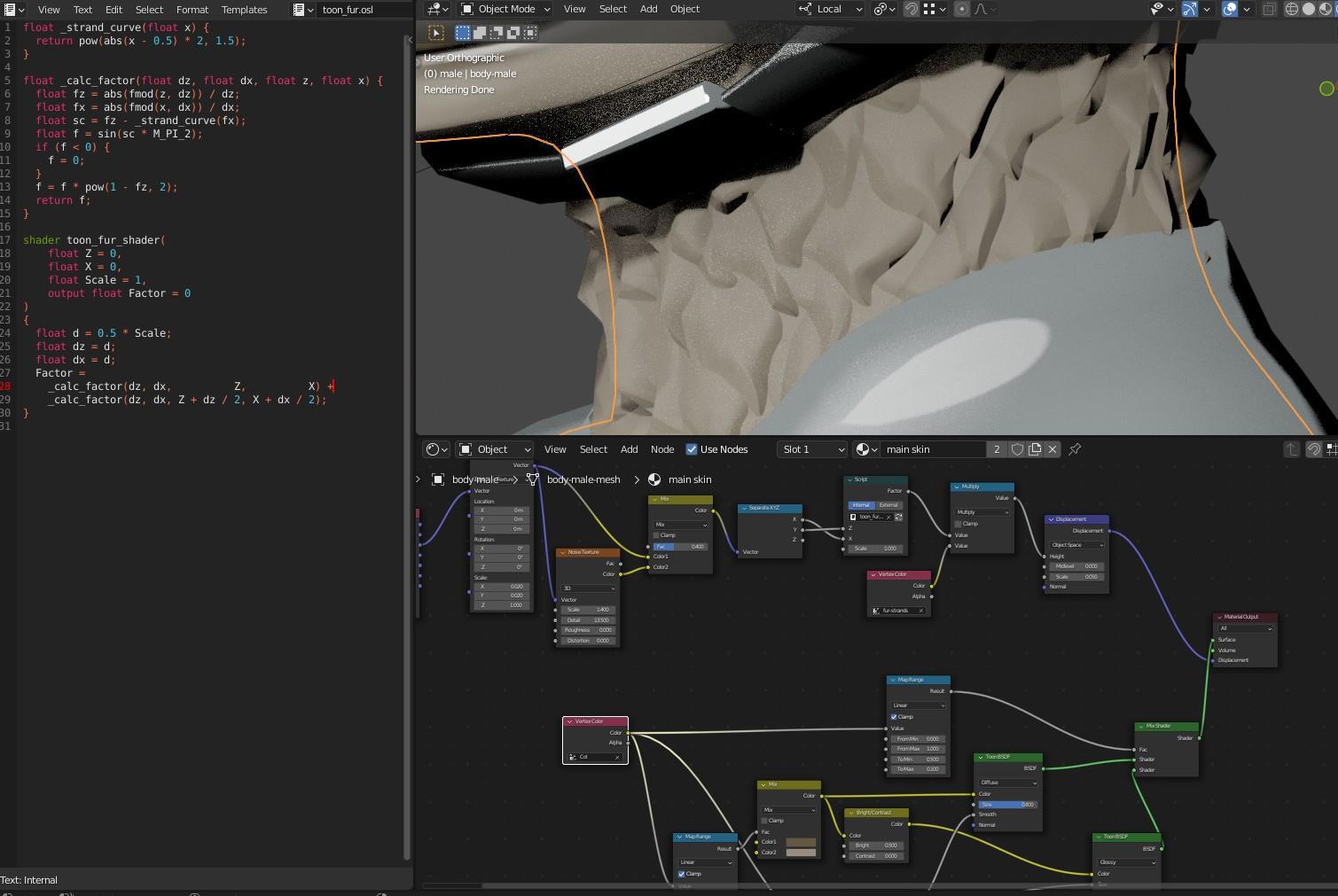 То что обычно генерит система частиц (particles/hair) надо расчёсывать, иначе оно просто торчит (или не просто, но не так как надо) — это ещё реально когда там полтора волоса на голове, но становится уныло для покрытого мехом персонажа в одежде да на склете.