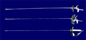 Чтобы читатели имели представление, как выглядит современное спортивное фехтовальное оружие, представляю следующий рисунок, где сверху вниз изображены рапира, шпага и сабля. Кстати, первые две изображены с пистолетной рукояткой, но встречаются и с обычной прямой. Для вашего сведения: спортивные шпага и рапира – оружие исключительно колющее. Рапира легче, всего 0,5 кг, с круглой гардой диаметром от 9,5 до 12 см и четырехгранным клинком длиной 90 см. Шпага потяжелее и клинок у нее пожестче. Вес шпаги 0,77 кг, длина трехгранного клинка 90 см, гарда круглая диаметром 13,5см. Сабля – рубяще-колющее оружие, клинок трапециевидный длиной 88 см, вес сабли 0,5 кг, гарда овальная с защитной боковой скобой.