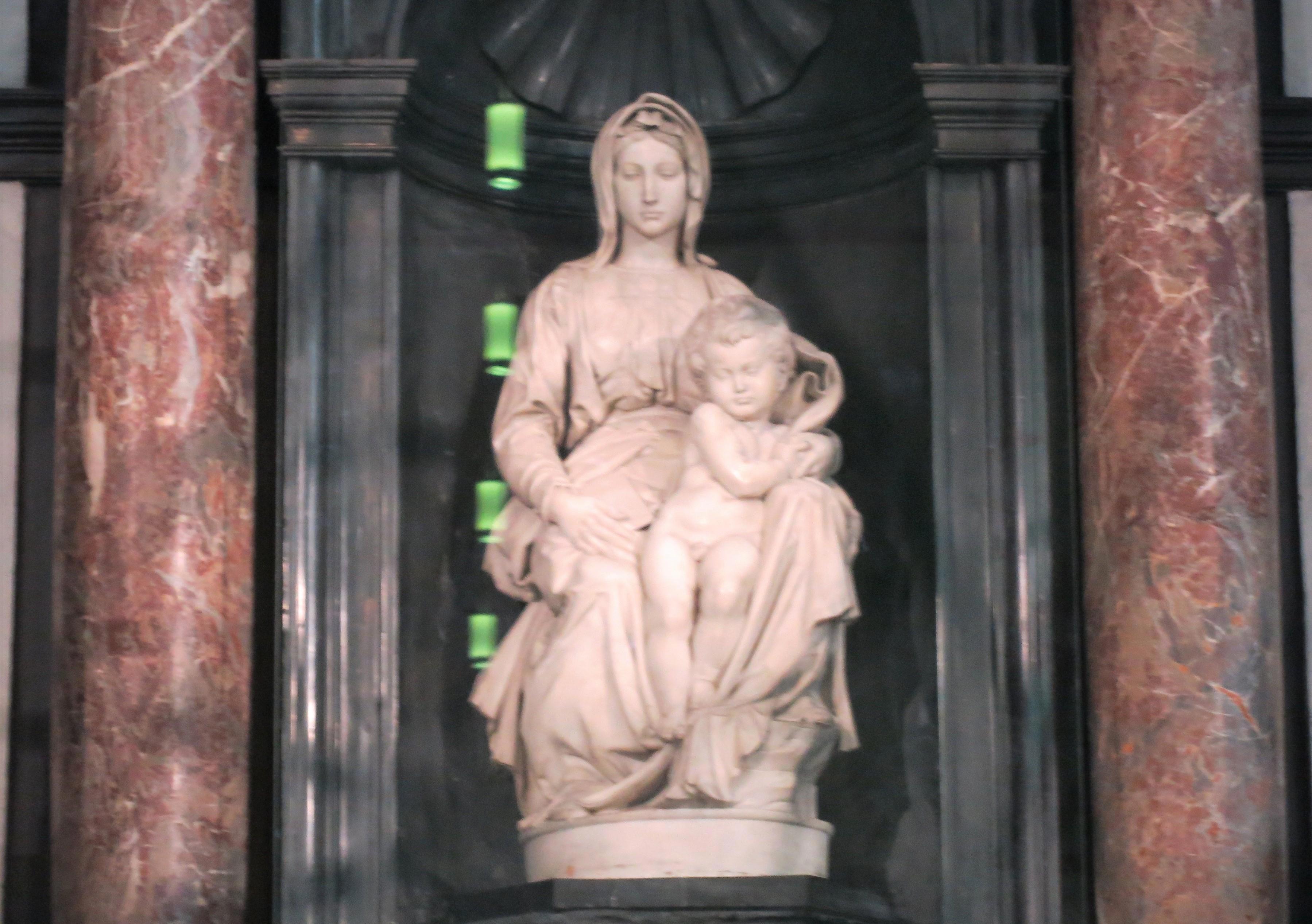 Скульптура Микеланджело "Дева Мария с младенцем" (1504 год) в церкви Богоматери. Не очень четко получилось, поскольку пришлось снимать издали с увеличением.