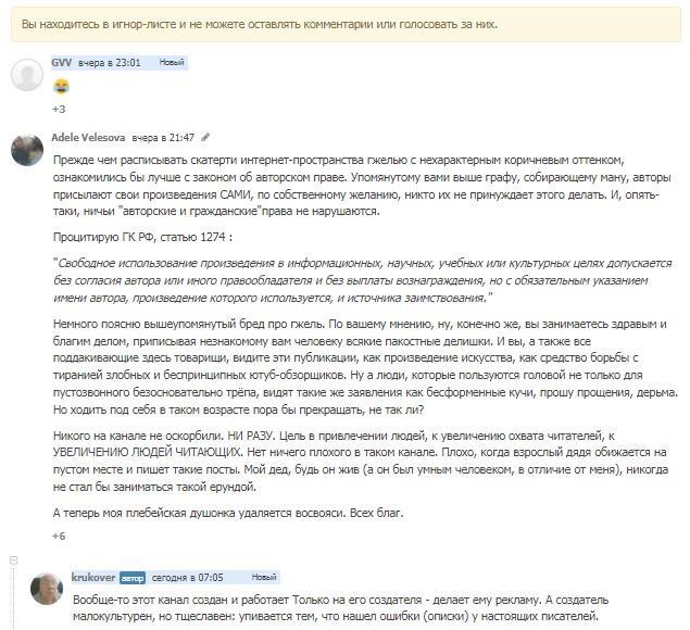 Человек с таким внушительным списком заслуг и такой ерундой занимается. Ц-ц-ц-ц. Впрочем, подумала я, ладно, всякое бывает. Не разобрался дядя, что к чему, видимо. Хотя, нет. Здесь правильнее сказать: И НЕ ХОТЕЛ РАЗБИРАТЬСЯ. А зачем? Человек в узких кругах влиятельный, можно и "покошмарить" молодого писаку, осмелившегося завести канал на ютуб.