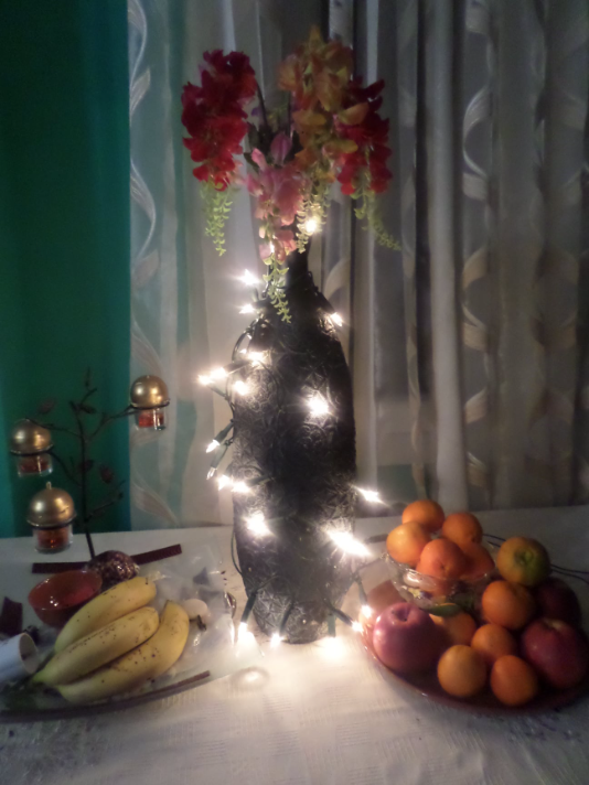 Один год, когда у нас также было много маленьких котят, елку мы поставить не решились, а праздника хотелось. И я сделала себе елку, намотав огоньки на вазу. Теперь вот решила не лишать себя праздника, и буду за него бороться.