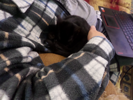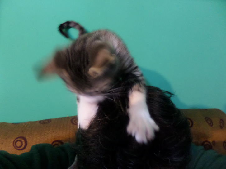 И Кузька не отстает. Вчера напала на Лушу, которая раза в три здоровее ее, и начала с ней драться. Луша, та не особо пришельцев жалует, особенно женского пола, а тут малявка на пути нарисовалась, не сотрешь. Ну, Луша недолго думая,отвесила оплеуху, Кузя аж в воздух взлетела. Приземлилась Кузя на свои четыре лапки, встала в позу и начистила Луше морду лица. У Луши был вид, будто бы она улитку проглотила. В общем, дам пришлось разнимать, потому что ни одна не желала уступать и только что в волосы друг другу не вцепились... Луша стояла на задних лапах, Кузя стояла на диване, весовые категории плачевно разнились, но ни одна не уступала. Позвали папку на помощь. Он, когда бы не запел "девочка Кузя", та бросает все свои соплячьи дела и несется к нему. Взбирается на грудь и начинает свои пляски вокруг его головы. А потом, намурчавшись и наобнимавшись, засыпает у него подмышкой.