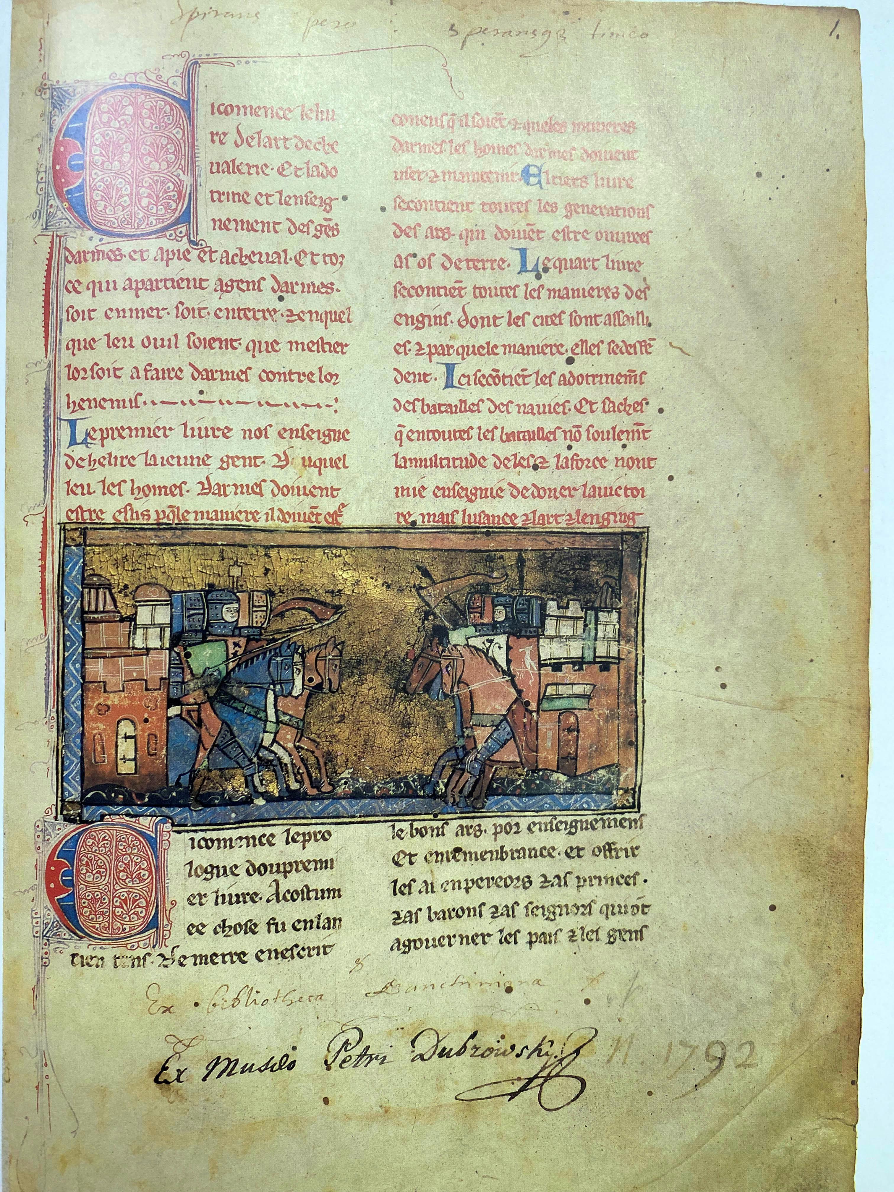 Текст IV века н.э., перевод и миниатюра — XIII века, автограф Петра Петровича Дубровского, который в 1792 году приобрел эту и многие другие рукописные книги (он поставил дату), перевод Жана де Мена, который как автор "Романа о Розе" неоднократно упоминался в прозе и поэзии более поздних веков, в том числе в XIX веке в романе "Три мушкетера"... А всего-то одна репродукция из книги...