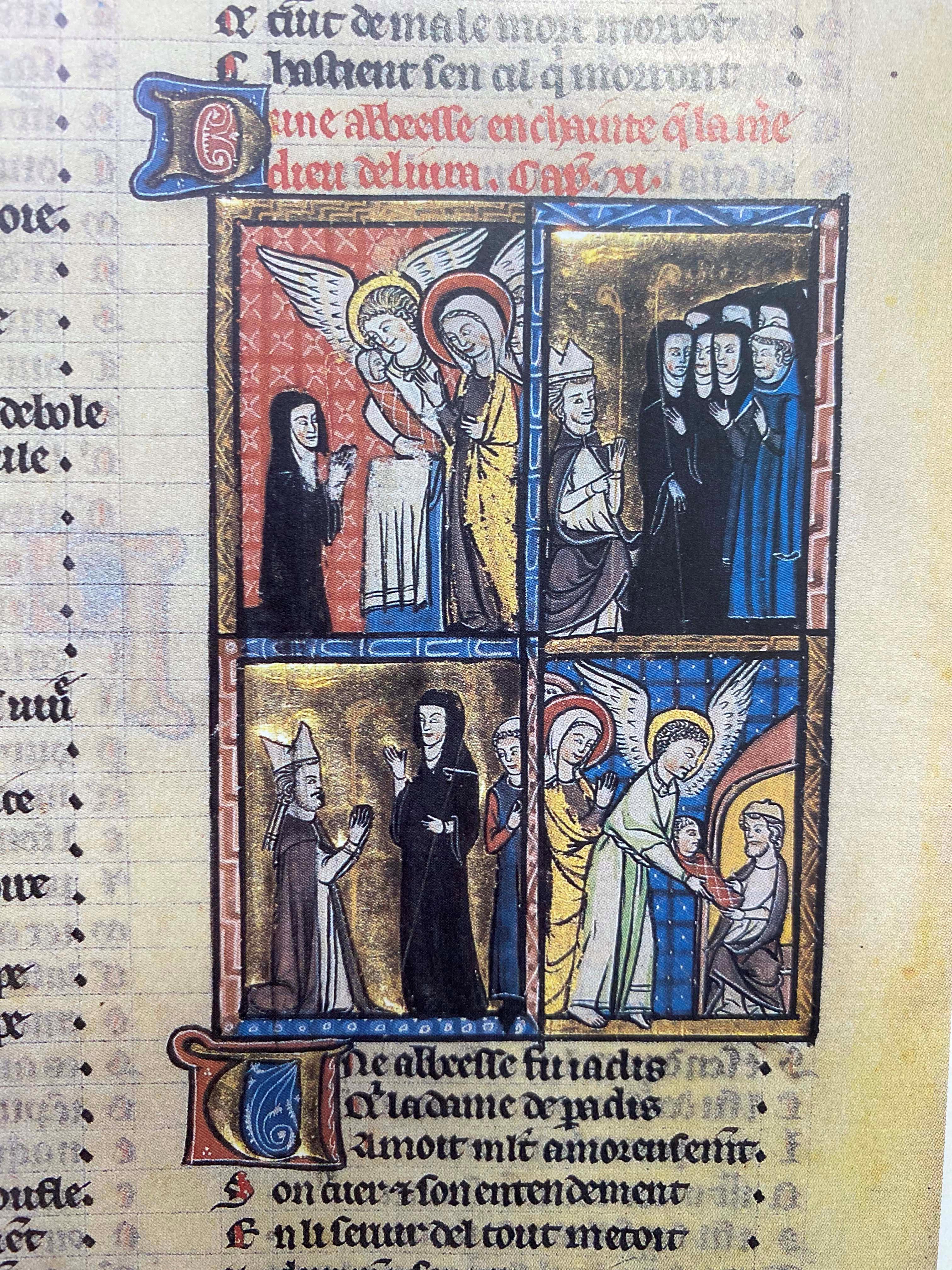 Некая настоятельница монастыря согрешила, но она так усердно молилась деве Марии, что та вместе с ангелами помогла ей успешно разрешиться от бремени, прикрыла ее во время инспекции епископа, а новорожденного ангелы отдали на воспитание в почтенную семью.