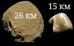 Спутники Марса - Фобос и Деймос. Фобос (26,8×22,4×18,4 км) несколько больше Деймоса (15×12,2×10,4 км)