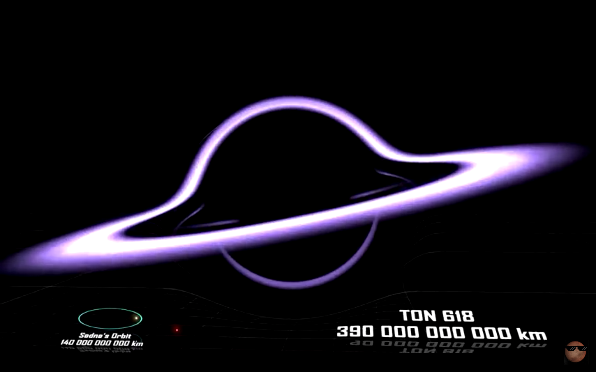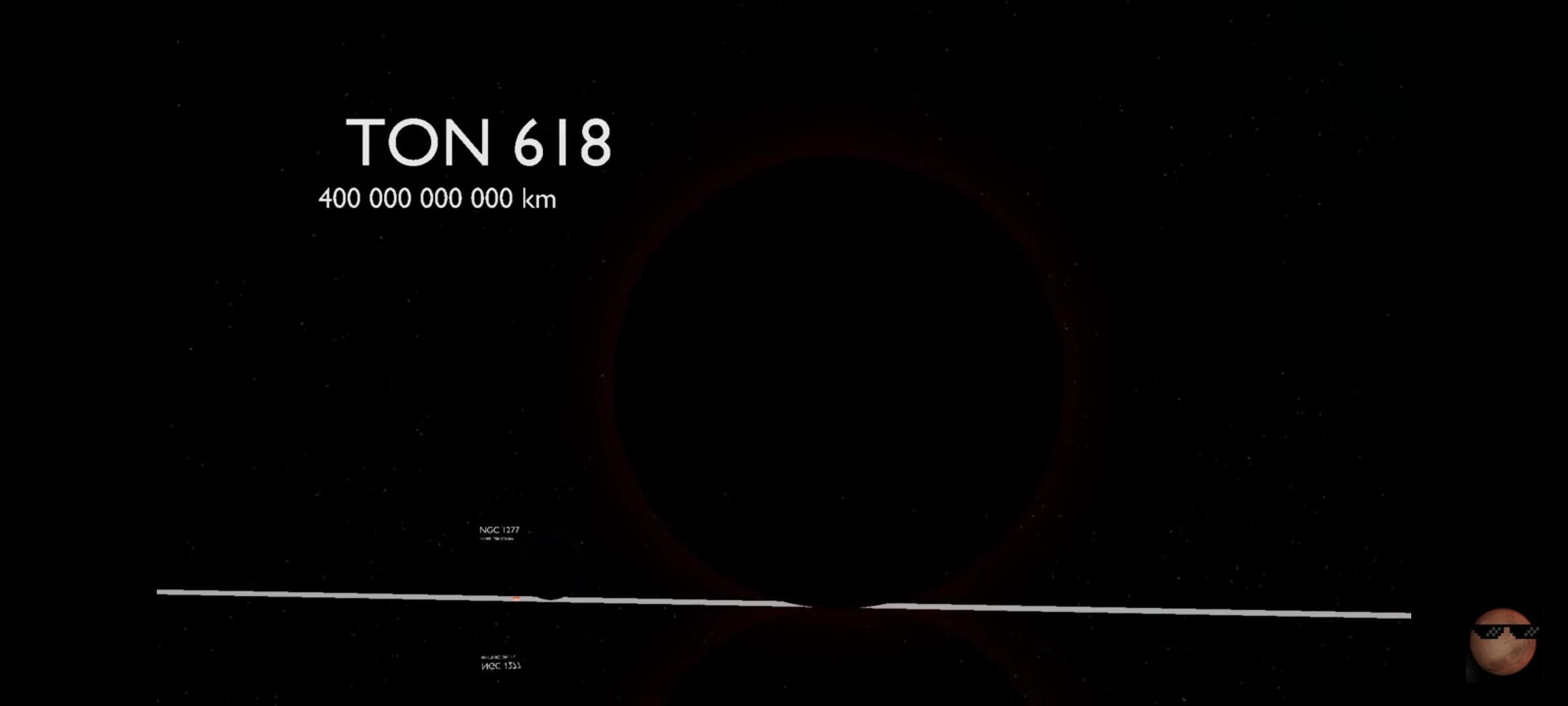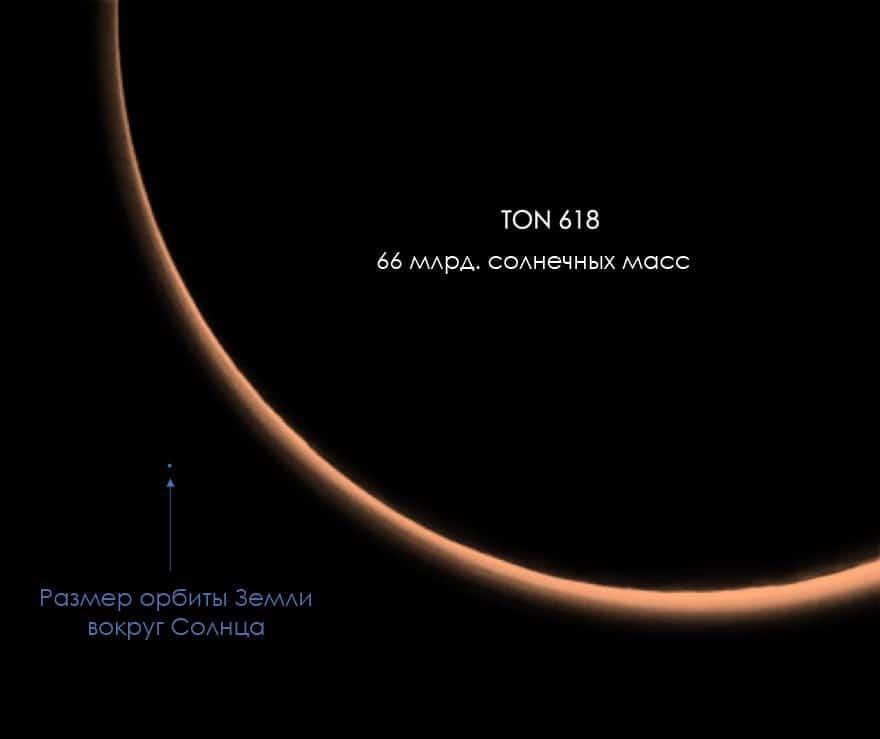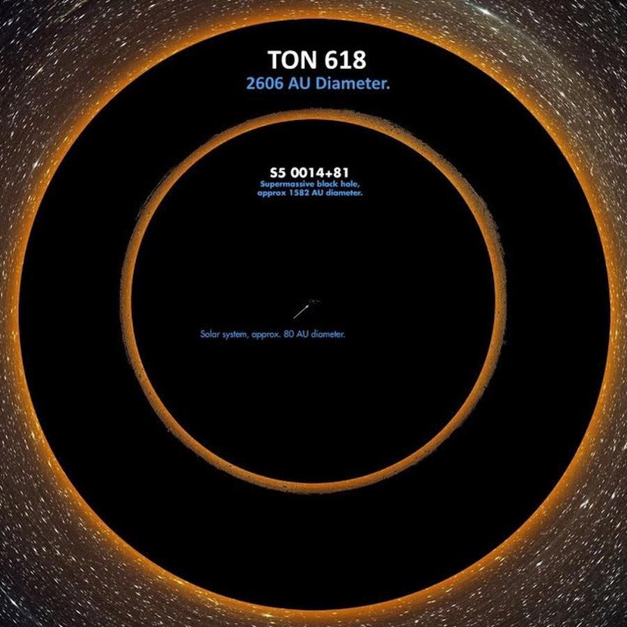 "Черная дыра", TON 618 — сверхъяркий радиогромкий квазар, расположенный вблизи Северного полюса Галактики в созвездии Гончие Псы. С квазаром связана ультрамассивная чёрная дыра массой 66 млрд масс Солнца.