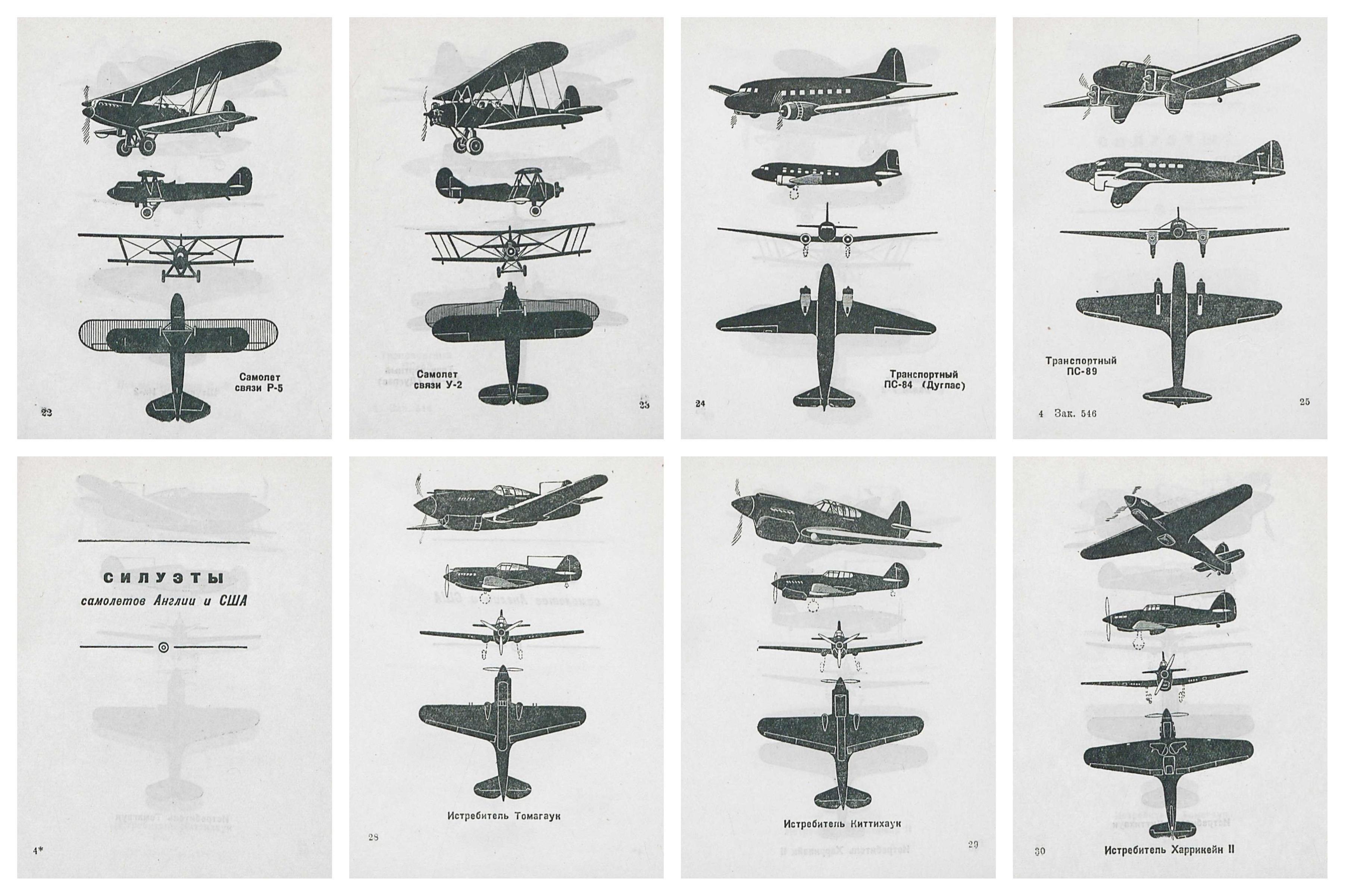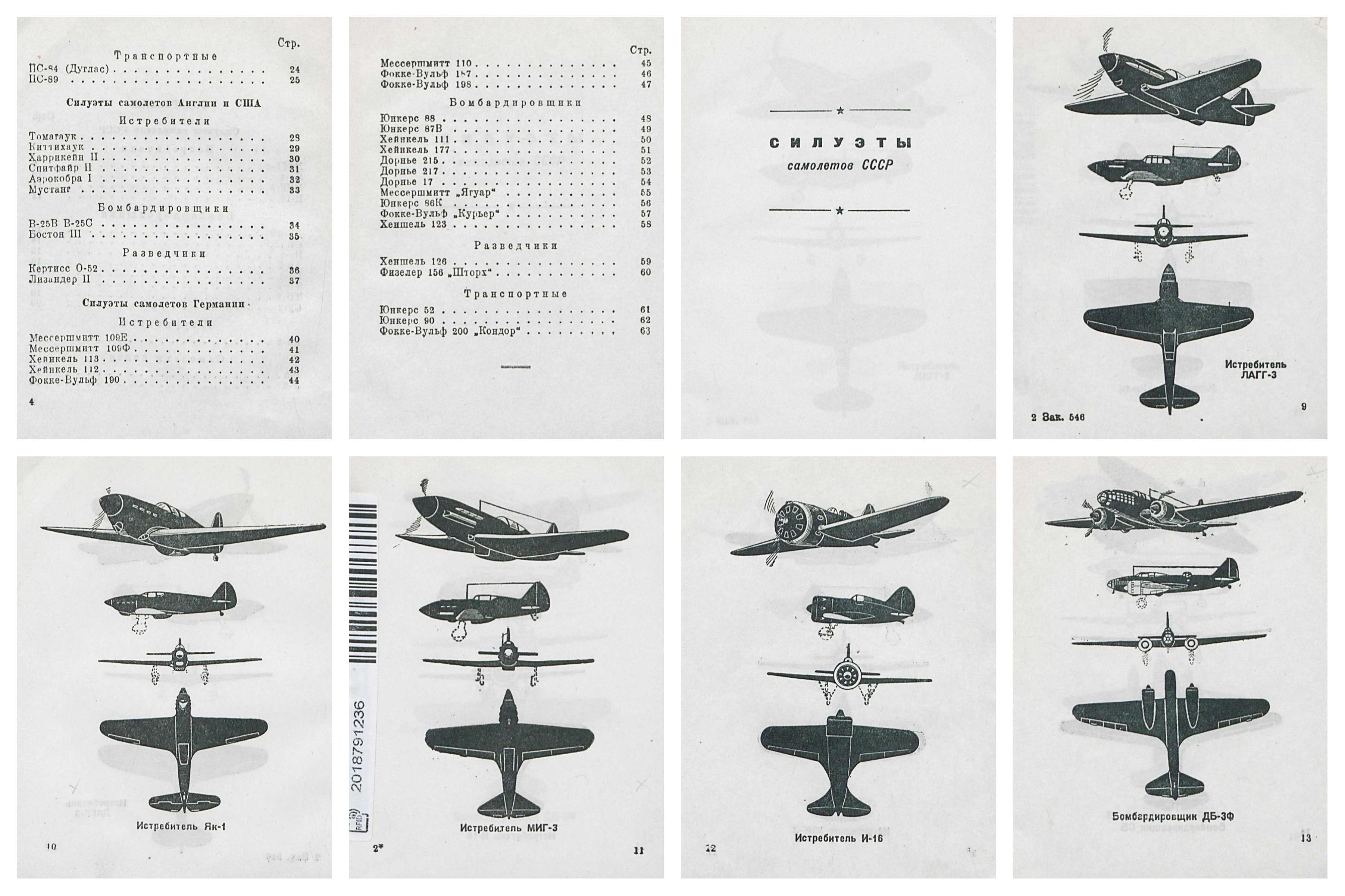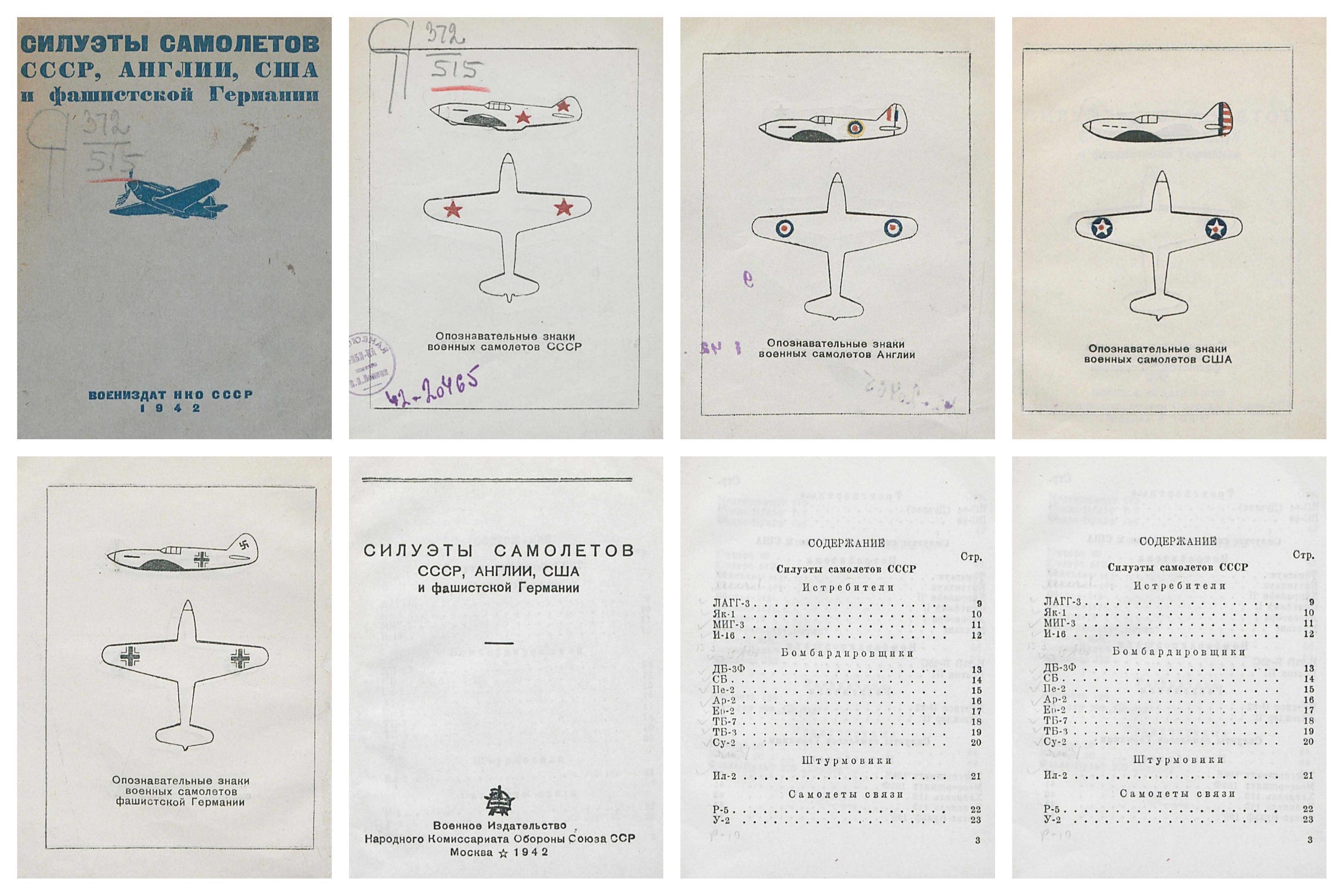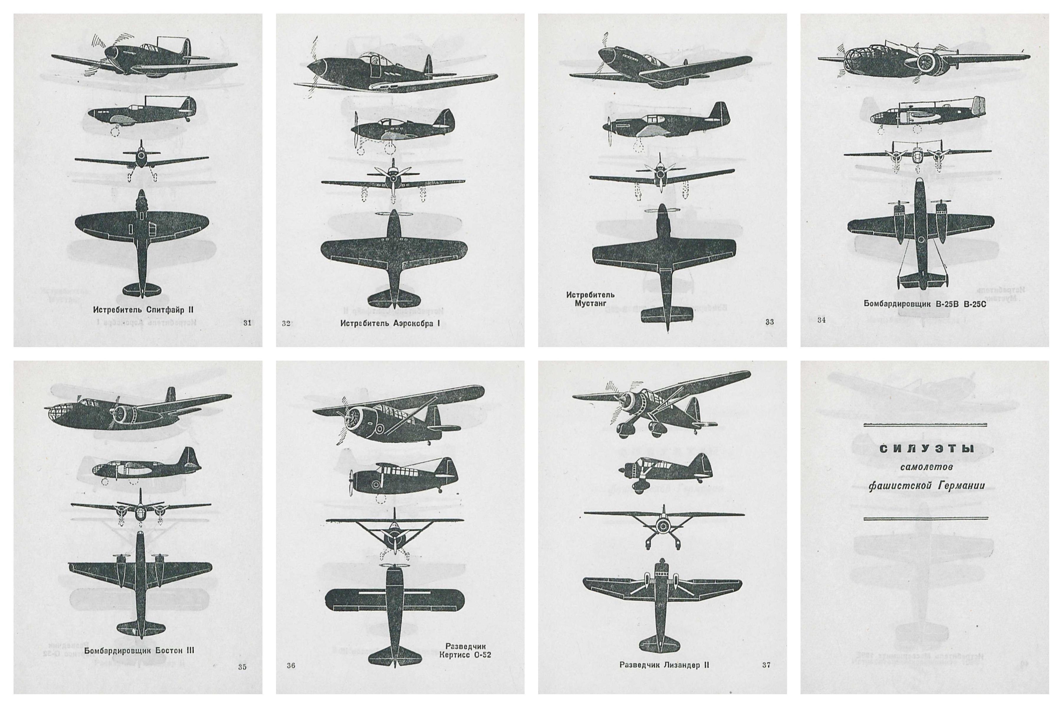 1942. Силуэты самолётов СССР, Англии, США и фашистской Германии.