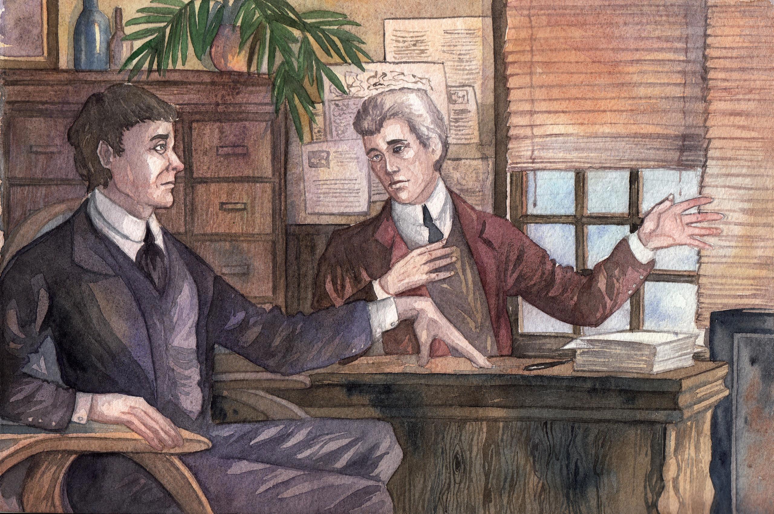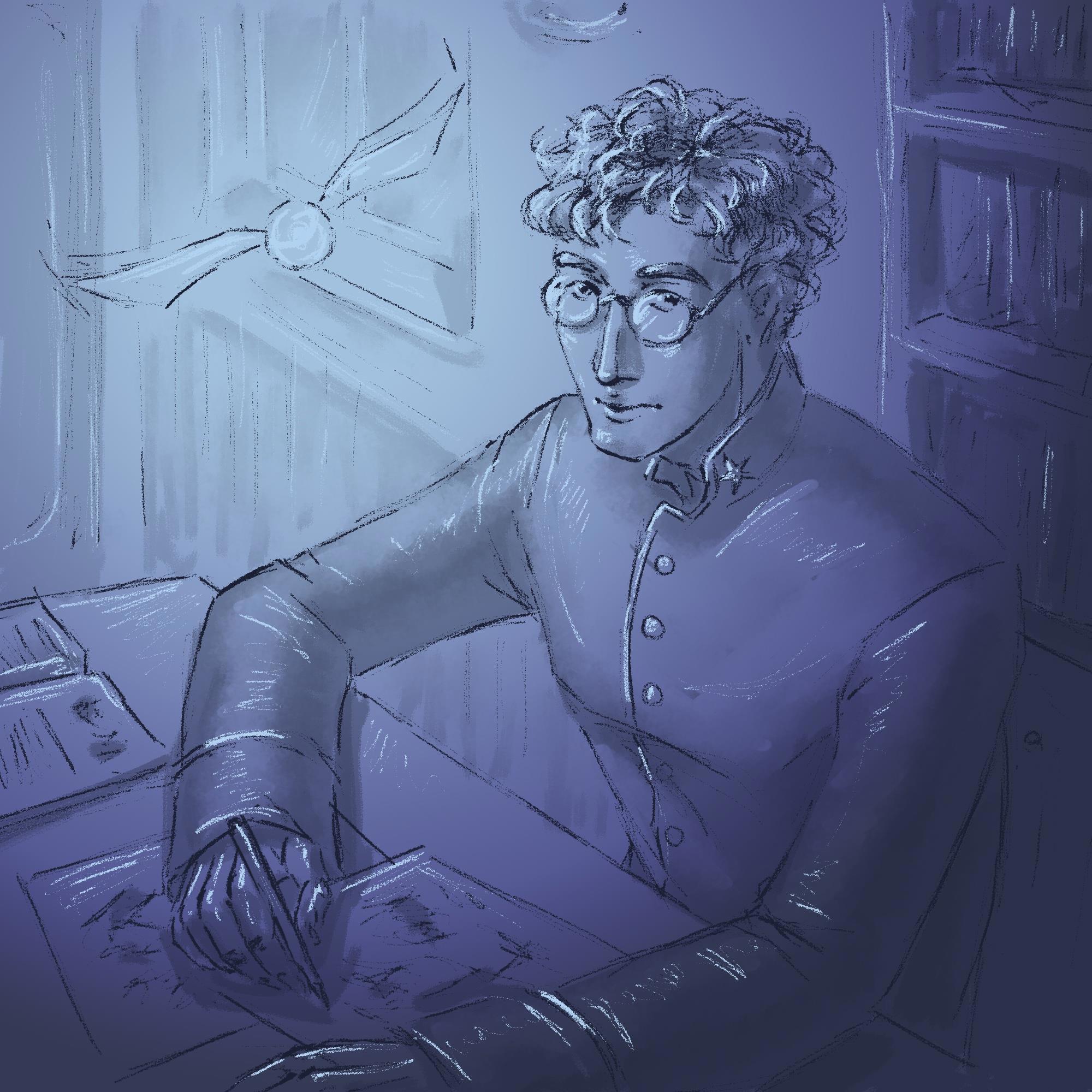 Вы только посмотрите на этого очаровательного молодого человека, который опять засиделся до глубокой ночи за своими выкладками-чертежами! Он тут так хитро изображен, что вполне может сойти и за студента, каковым я просила его изобразить, и за дипломированного магистра, у которого за окном прячутся разные опасные Тени)))