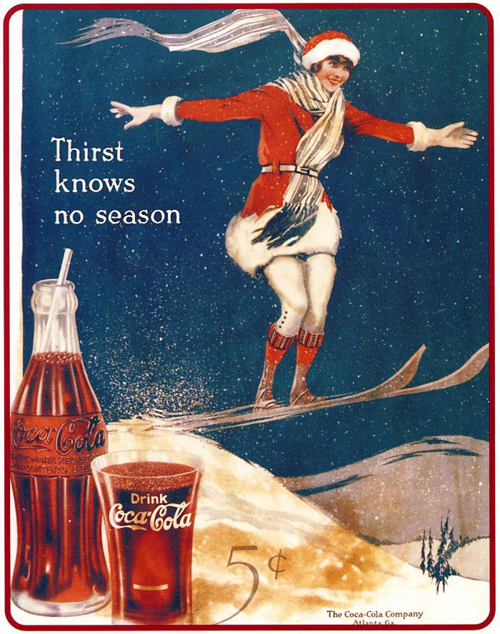 Впервые зимняя рекламная кампания напитка началась в далеком 1920-году. Колу пили к тому времени, практиченски, во всех странах мира, но... В основном летом. Тогда некий дизайнер Арчи Ли из рекламного агентства D’Arcy придумал для напитка новый слоган «У жажды нет сезона» и создал первую «зимнюю» рекламу. На ней была лыжница в красном костюме напоминающем наряд Санты.