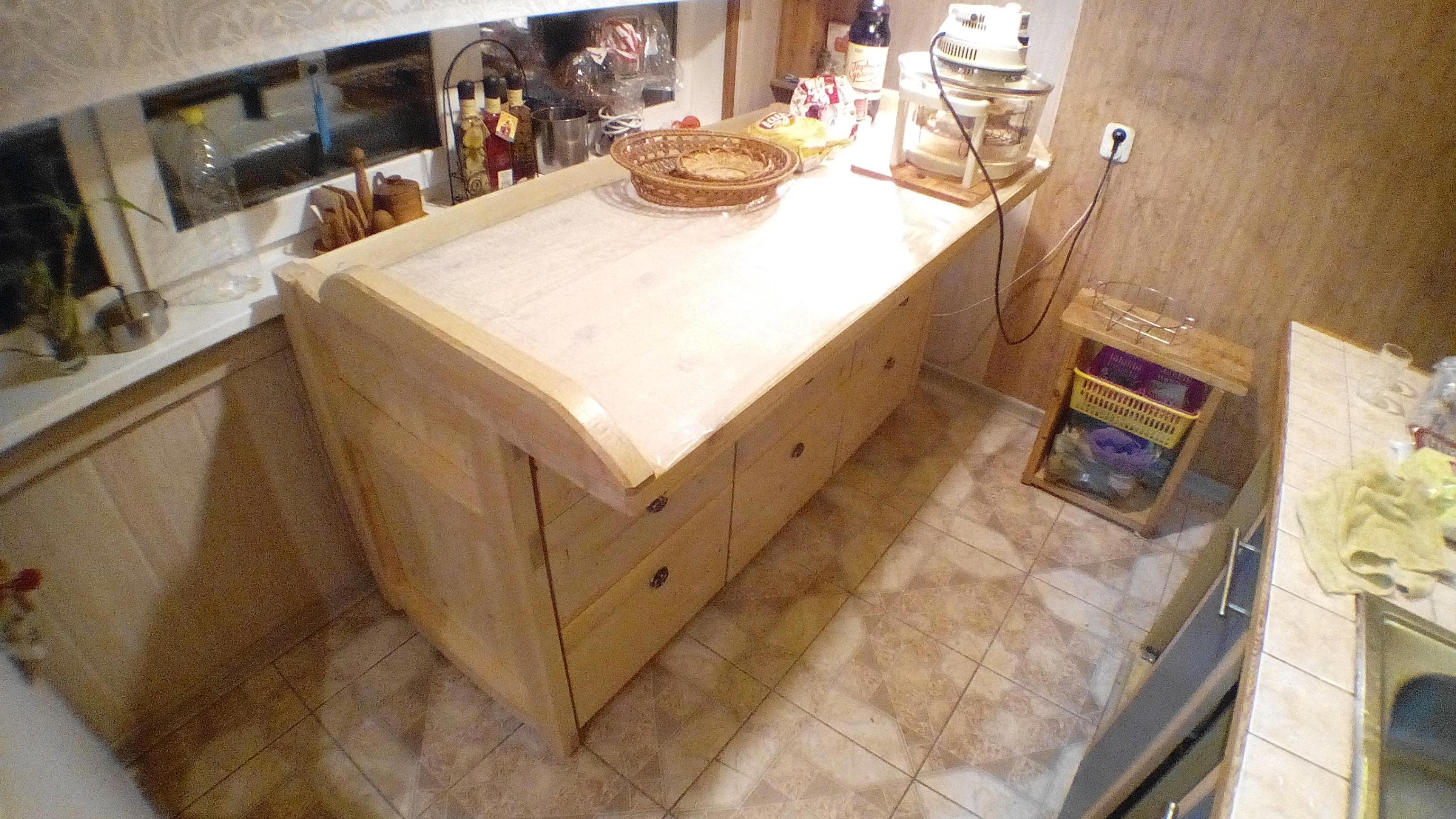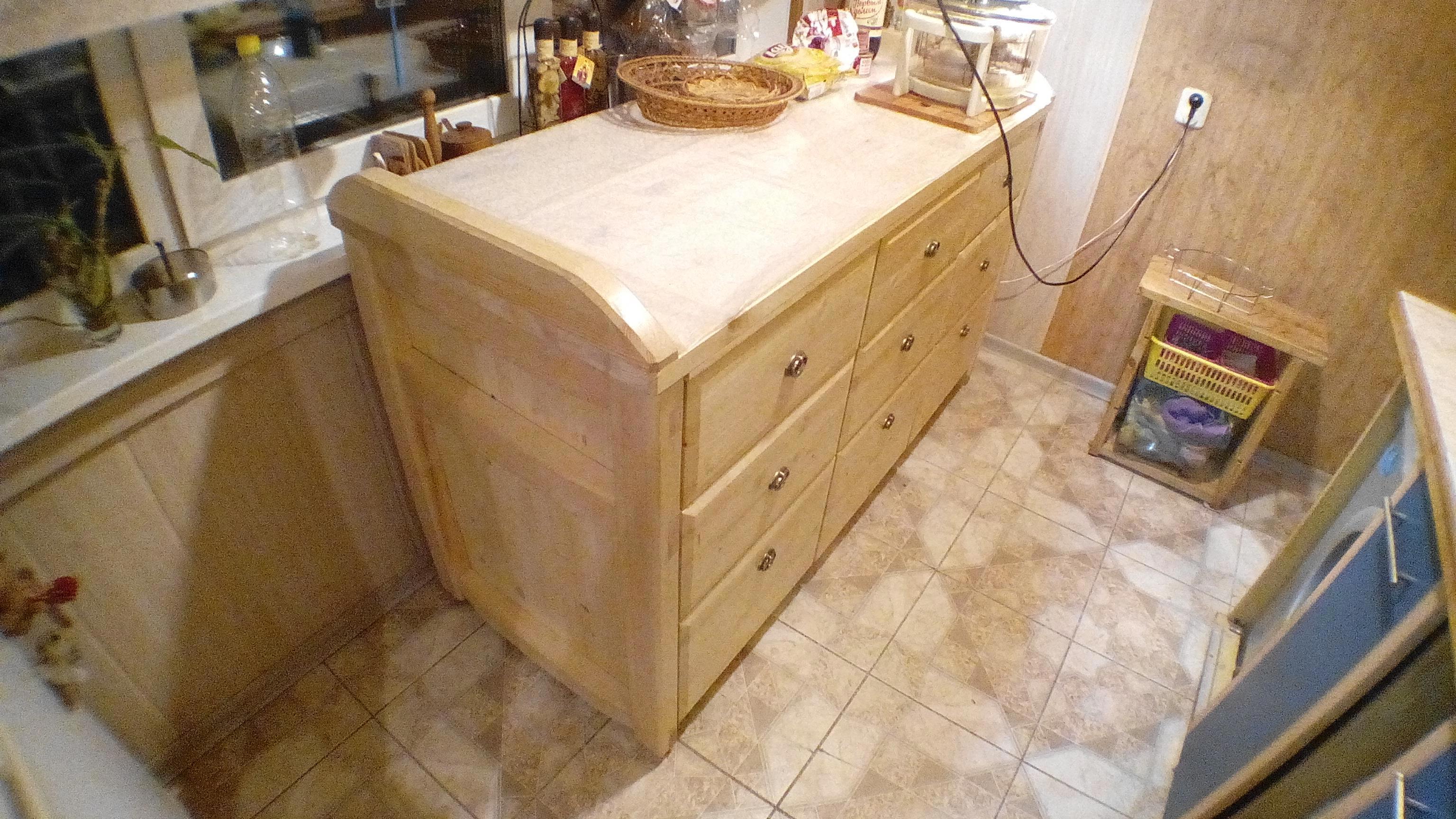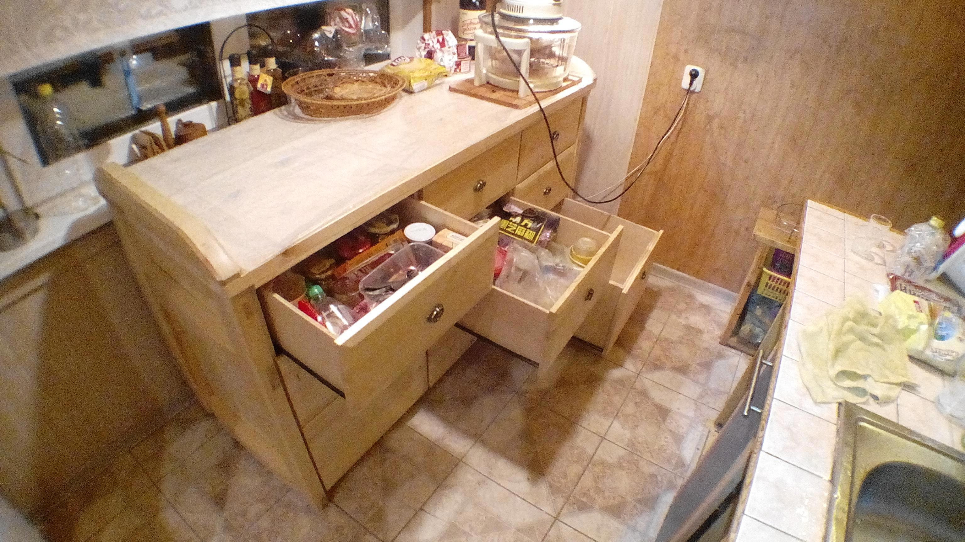Перед вами сосново-березовый монстр. Рублен в лапу. Без электричества. Но не при свечном освещении. О девяти ящиках. В самые нижние можно заезжать на аэрогриле, как к себе в гараж. В остальные сметать китайские палочки для еды. В длинну он метр пятьдесят. В ширину 0,6. В высоту - 0,89... Столешница поставлена на выкатные направляющие, что позволяет вкушать сычуаньскую кухню прямо на комоде. А сзади, во всю длину разлегся лоток под всякую мелочь пузатую. Чайники, и прочая... Как то так.