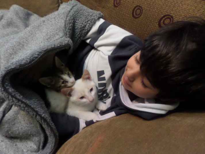 Вот ты глянь, какие трусишки оказались эти наши одноглазики. Но зато внук оторвался по полной с нашими старожилами. Те позволяли ему себя тискать, таскать, играть и обниматься. Тех мы уже давно укротили и одомашнили до такой степени, что они дерутся за право спать на груди у мамы и у папы.