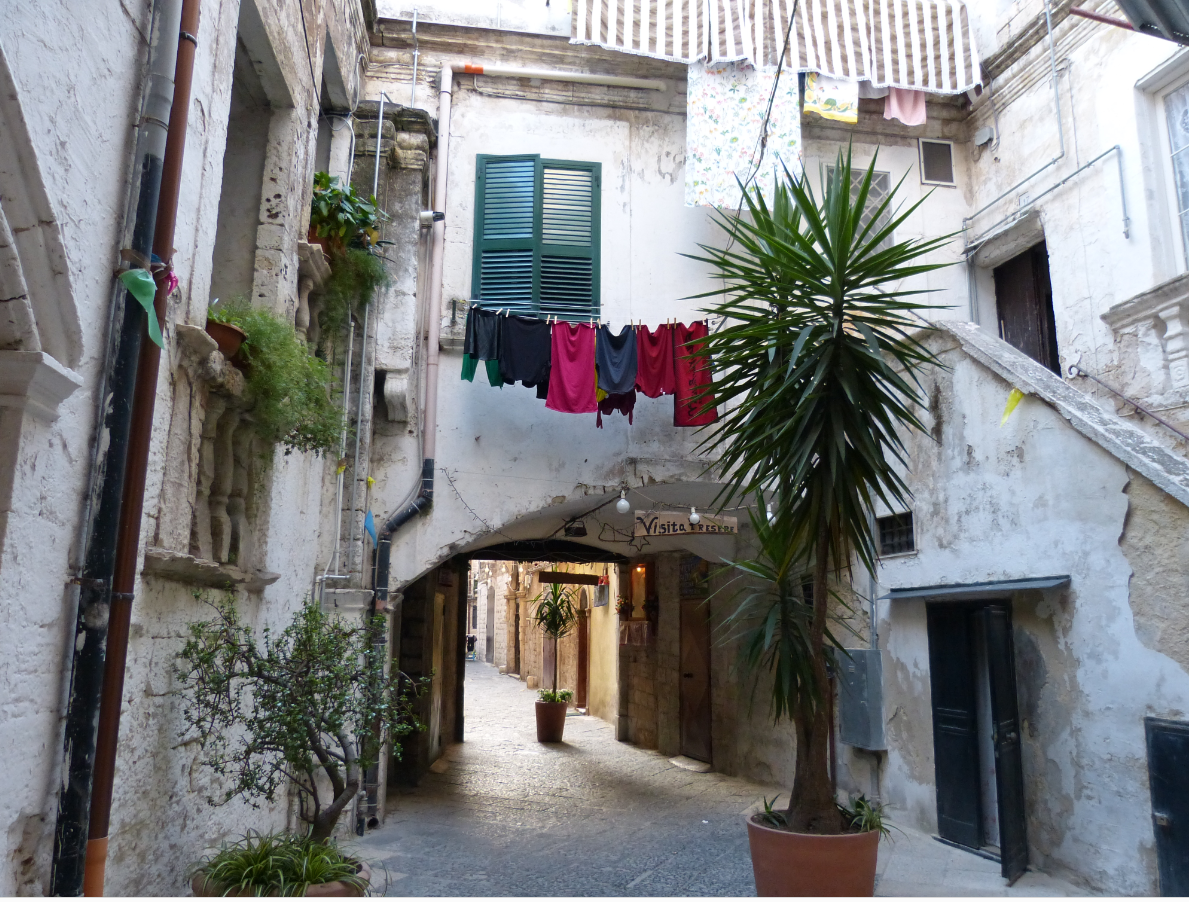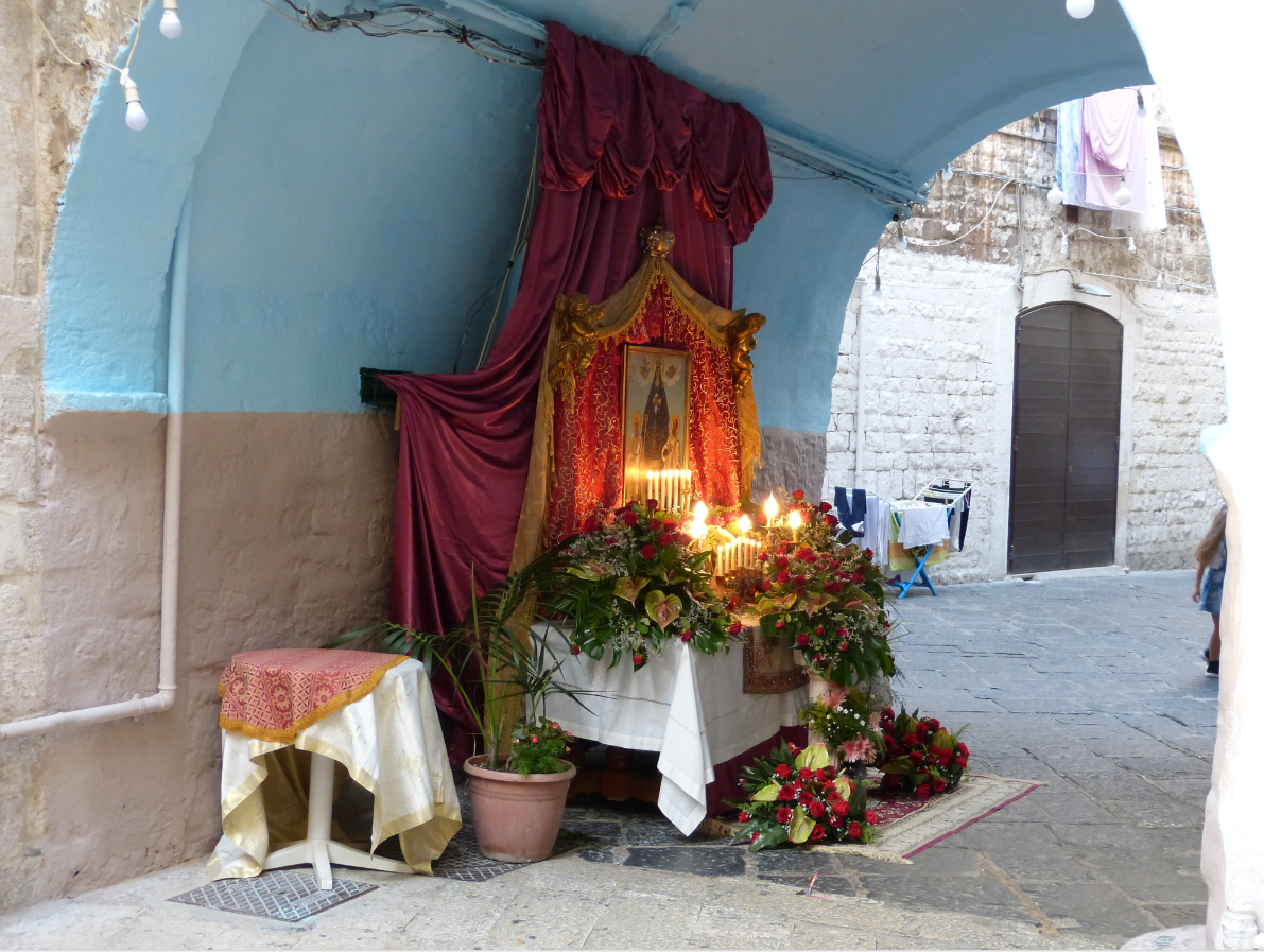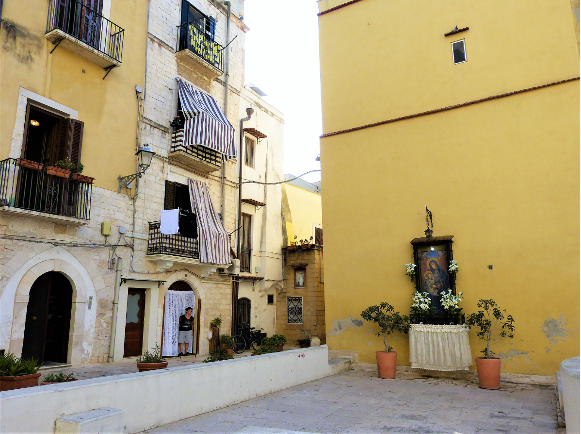 Старый город в Бари ещё называют San Nicola, в честь базилики Святого Николая. Тут все двери нараспашку и вся жизнь нараспашку, как будто на машине времени переместился на полстолетия назад! В каждом дворике — иконы с Мадонной или со Святым Николаем, украшенные цветами.