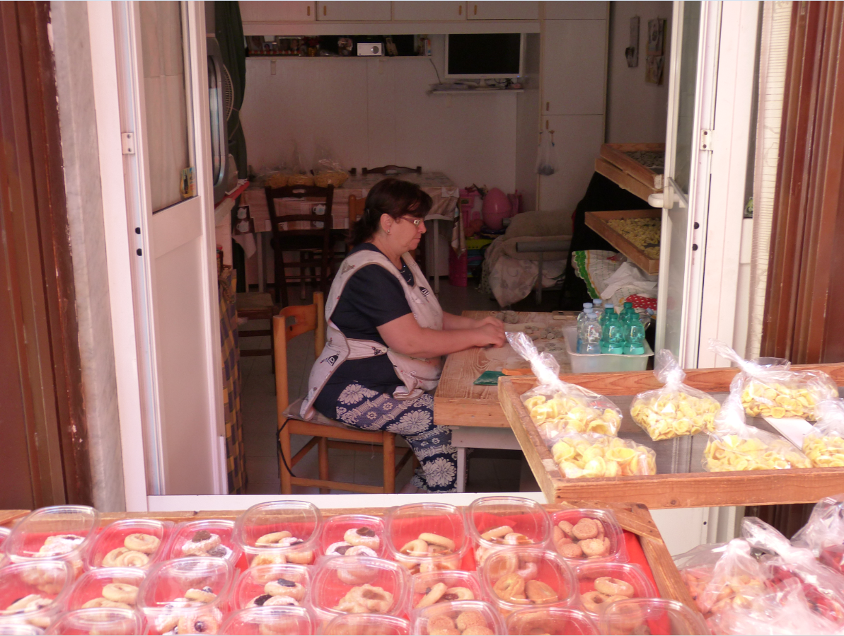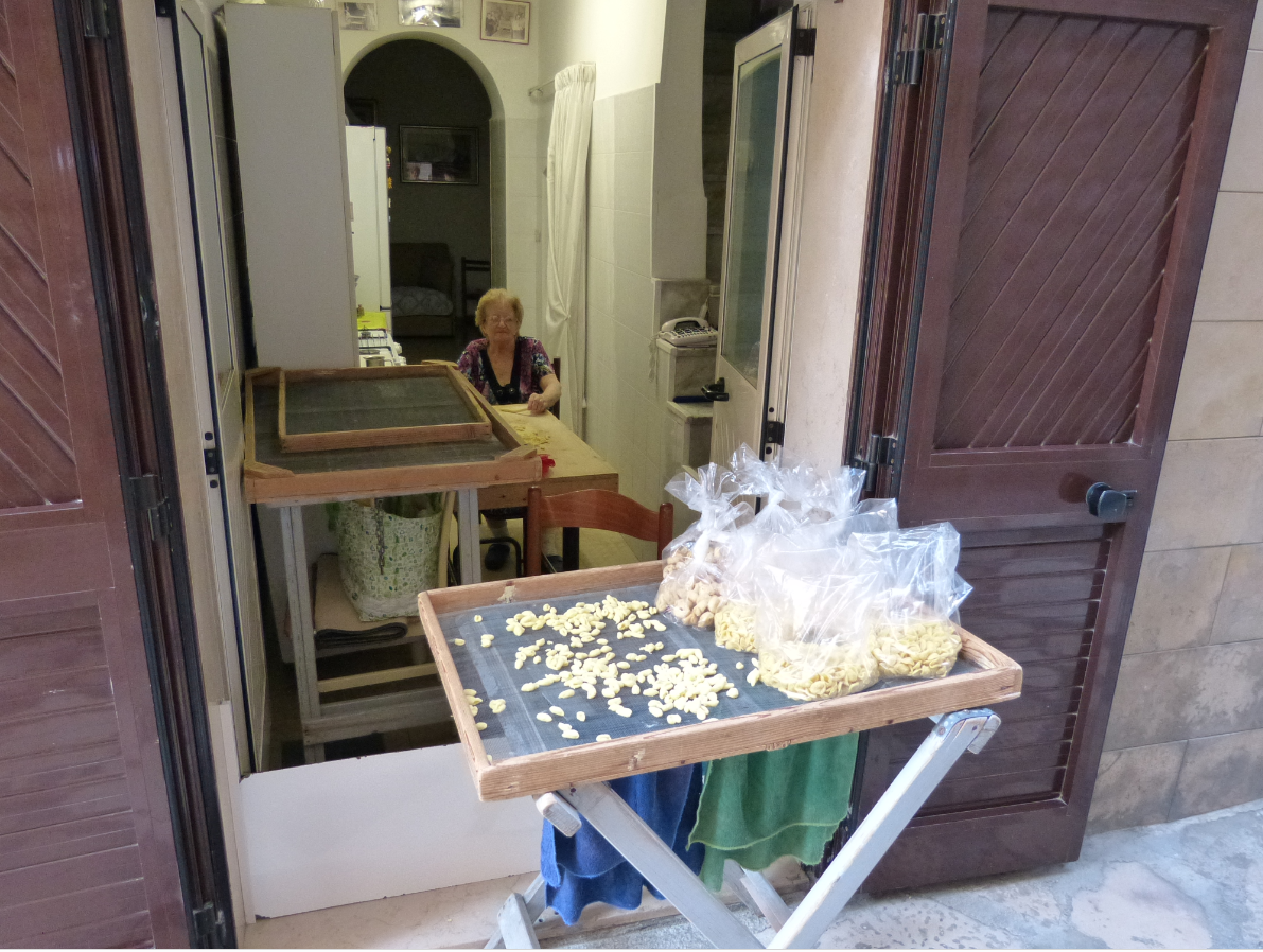 Но самым колоритным местом San Nicola, на мой взгляд, является улочка Arco Basso, получившая во многих путеводителях второе название Strada delle Orecchiette. Здесь, в двух шагах от средневекового замка Бари, местные жительницы прямо под открытым небом делают и продают домашнюю пасту, преимущественно орекьетте, «ушки». У дверей собственных домов они выставляют столики, на которые выкладывают готовую продукцию.