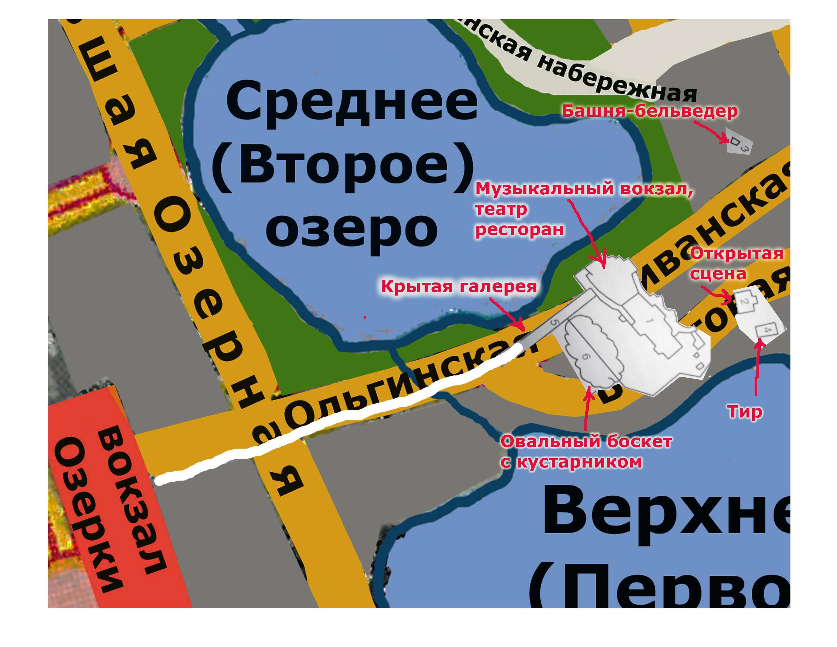 Автор: ЗлатаДо сих пор для меня остается загадкой, как на достаточно узком перешейке помещались все эти культурные объекты. Карту для пущей наглядности сама разрисовала в графическом редакторе. Фрагменты чертежа позаимствованы из путеводителя Г.Зуева К вокзалу Озерки вела крытая галерея. И, кстати, вокзал первоначально предназначался не для железной дороги, а для концертов. Невероятно, но вполне исторический факт.