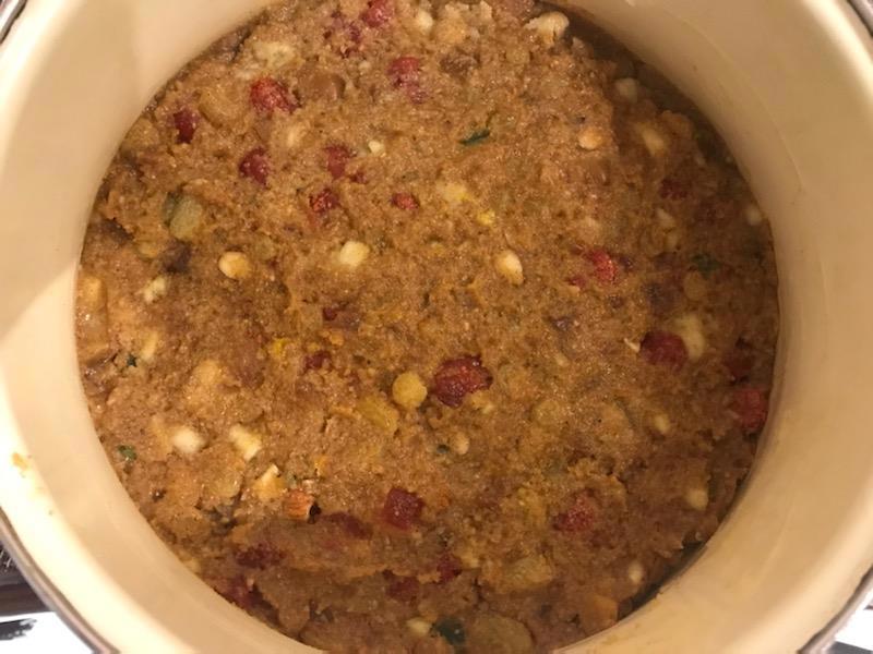 4. Накрыть форму двумя слоями бумаги для выпечки и фольгой и крепко завязать (я использую скотч). Поставить посудину на водяную баню на 7 часов (воду постоянно придётся подливать!). В конце пудинг остудить, удалить бумагу, сделать несколько проколов и полить бренди (1 ст. л.), потом накрыть новым листом бумаги для выпечки, перевязать и поставить в холодильник на месяц.