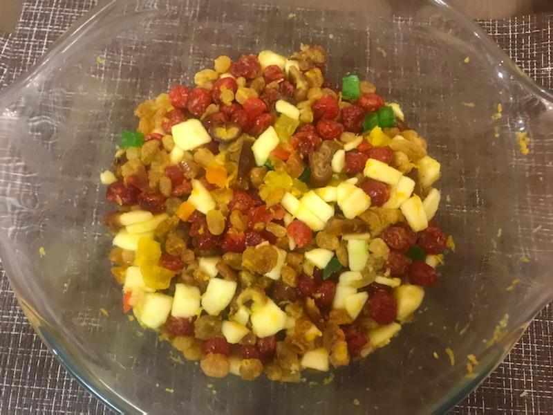 1. Сухофрукты (без смородины, потому что сушёную смородину найти нереально), цукаты, порезанные финики, яблоко (очищенное от шкурки и порезанное на мелкие части) залить свежевыжатым апельсиновым и лимонным соком, добавить 4 столовые ложки бренди (или рома) и как следует перемешать. Потом накрыть посуду полотенцем и оставить на сутки в холодильнике.
