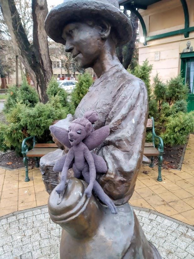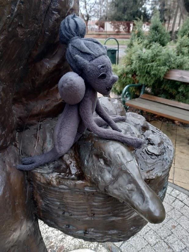 Этот бронзовый молодой человек идет с покупками от Старого рынка (которого там уже давно нет, как давно — не знаю, чем именно примечателен этот молодой человек, кроме того, что купил гуся — тоже не знаю). Мицу всё равно, он сел и едет. Подумывает наверняка, а не порыться ли в корзинке?