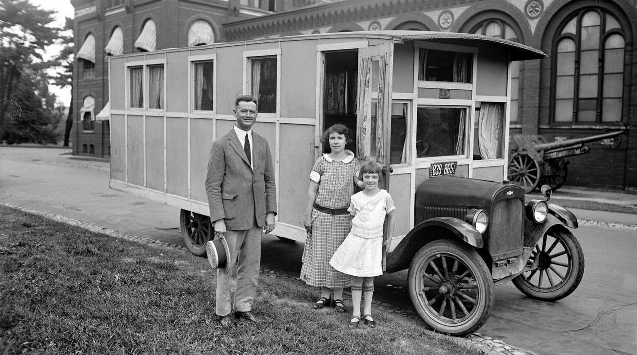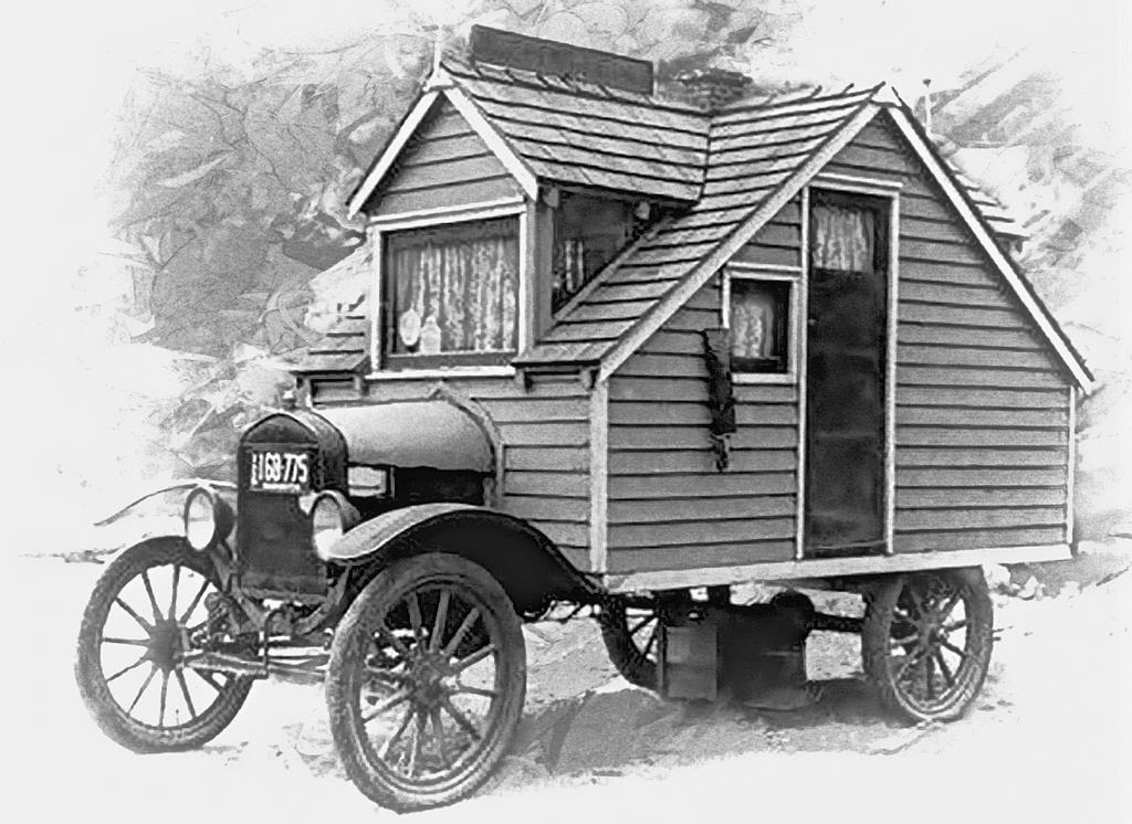 Привыкли люди когда-то к повозкам. Может поэтому, как только появились первые автомобили в товарных количествах, так сразу люди стали пытаться сделать из них дома на колёсах. Первые часто выглядели достаточно нелепо. То есть просто берём машину и присобачиваем к ней нечто больше похожее на курятник. Даже занавесочка на лобовом стекле есть: