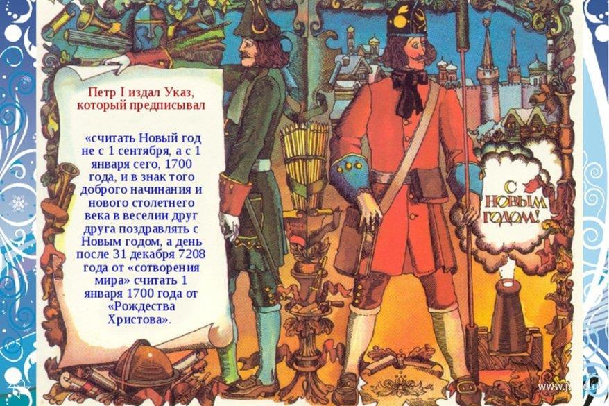 В 1699 году, в преддверии нового, 1700 года, Петр I издал указ, согласно которому начало года следует отсчитывать с 1 января по примеру всех христиан, живших не по юлианскому, а по григорианскому календарю. Менялось и летосчисление. Если раньше оно велось от сотворения мира, то теперь — от Рождества Христова. Именной указ провозглашал: