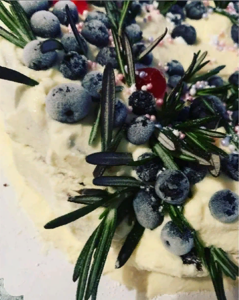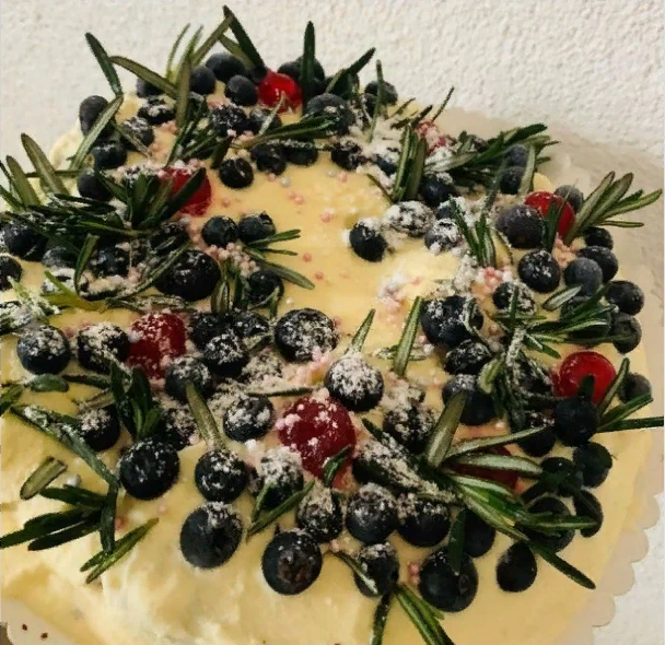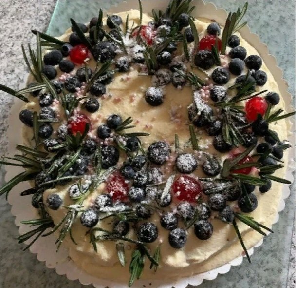 Далее, промазываем слои, и покрываем этим кремом сам тортик. Моя подруга украсила его свежемороженными ягодами вишни и голубики, листиками розмарина, а также — посыпкой для украшения тортов и пирожных. Но тут можно пофантазировать, т.к. голубика есть не у каждого.