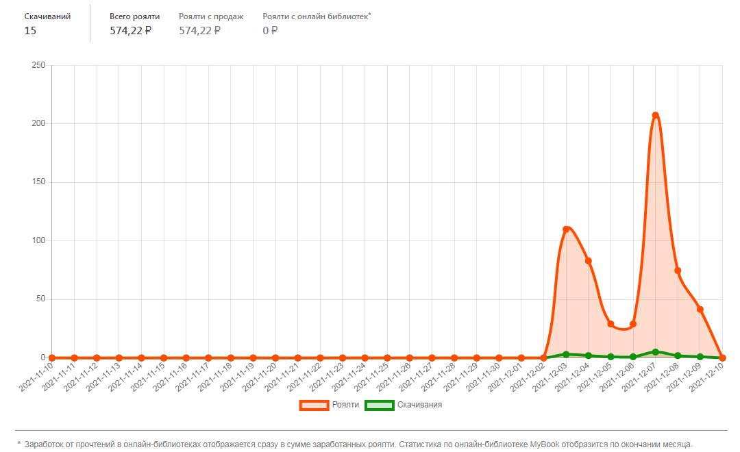 За неделю 15 скачиваний. Роялти на экране. В связи со скидками, вознаграждение автору вместо положенных 25% составило меньше 20%.