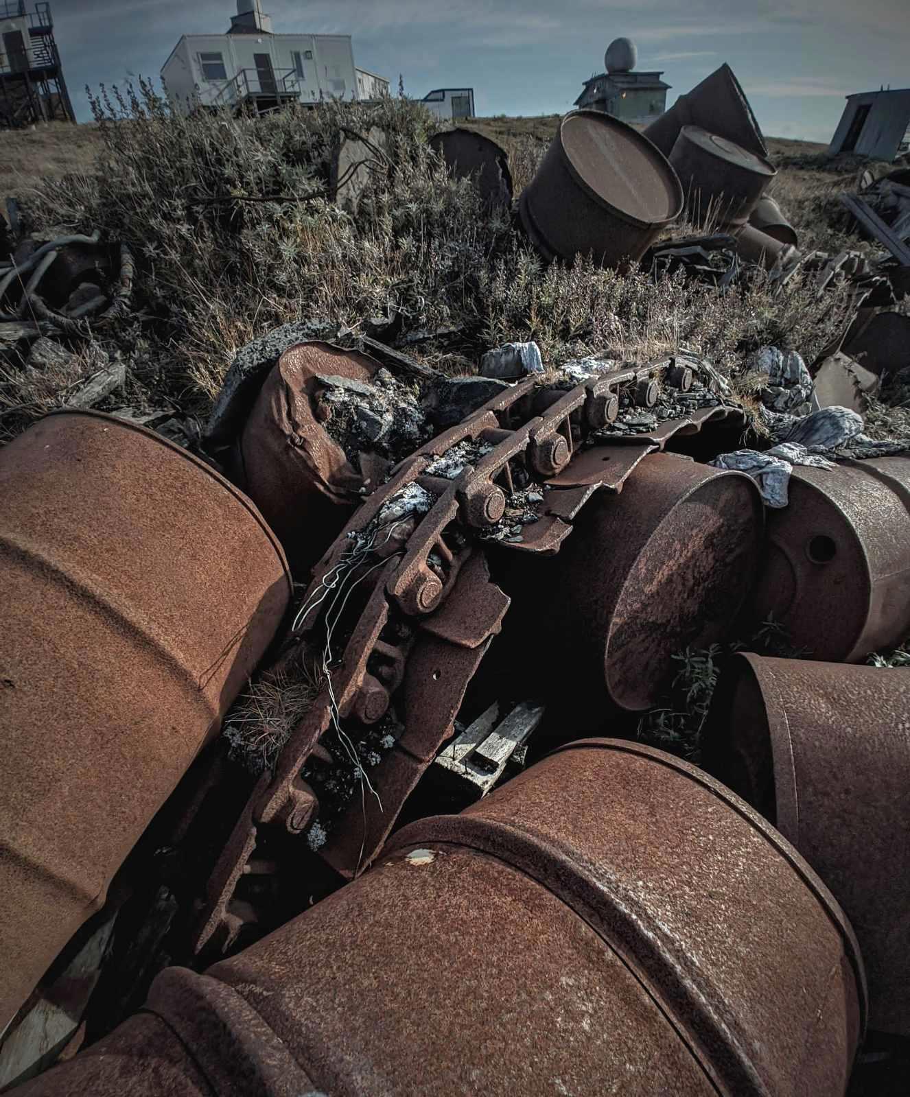 Потянуло на образность. Длиннющий вездеходный трак уполовиненным знаком бесконечности оплел бочки, скрылся в земле. Словно сытый змей, охраняющий свои сокровища… Оборачиваюсь. Товарищи снуют среди торчащих балок, раскачивают ломами, выламывают листы железа, выдирают бочки. Красные шапки то появляются над косогором, то пропадают.